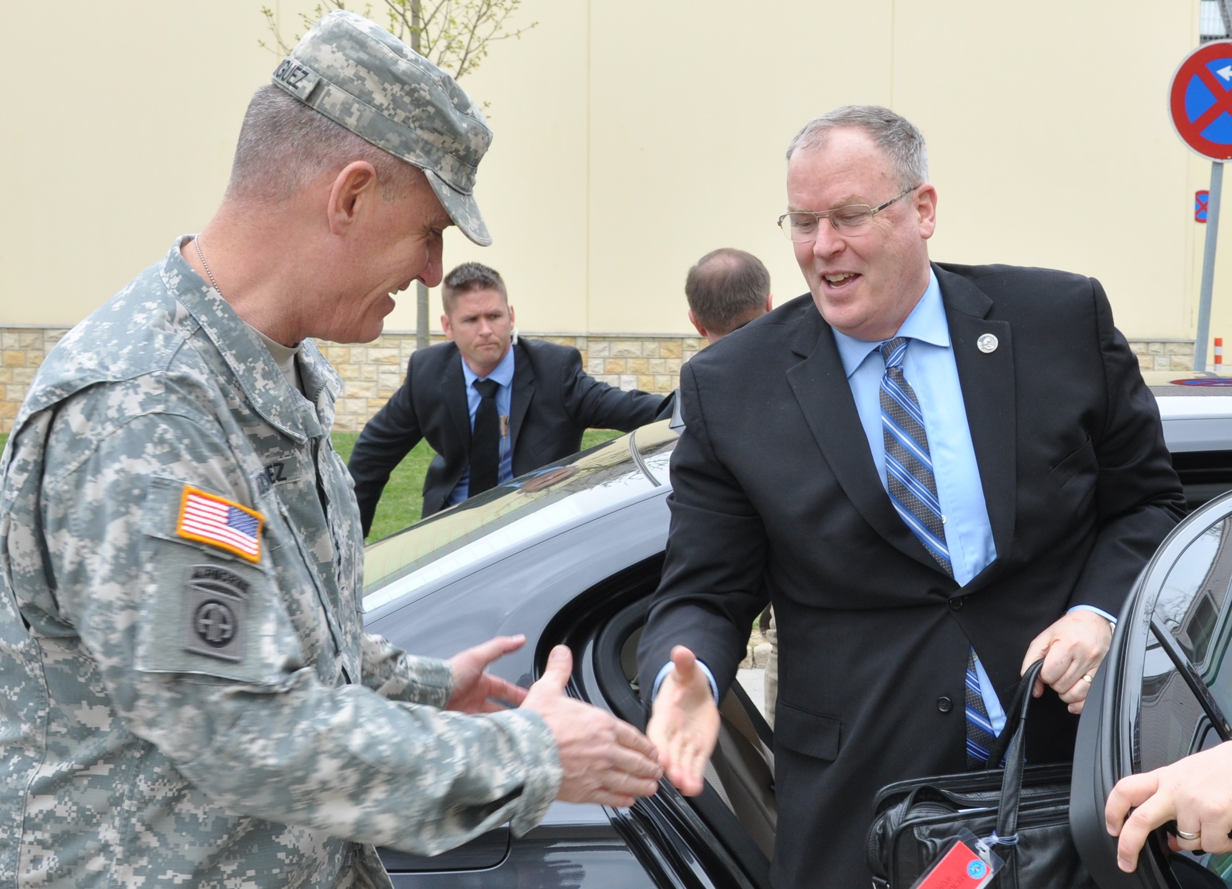 General David M. Rodriguez, U.S. Africa Command commander, welcomes Deputy Secretary of Defense Robert O. Work to the command headquarters in Stuttgart, Germany, April 17, 2015. This is Secretary Work’s first visit to AFRICOM. (U.S. Africa Command photo by U.S. Air Force Tech. Sgt. Olufemi A. Owolabi/RELEASED)