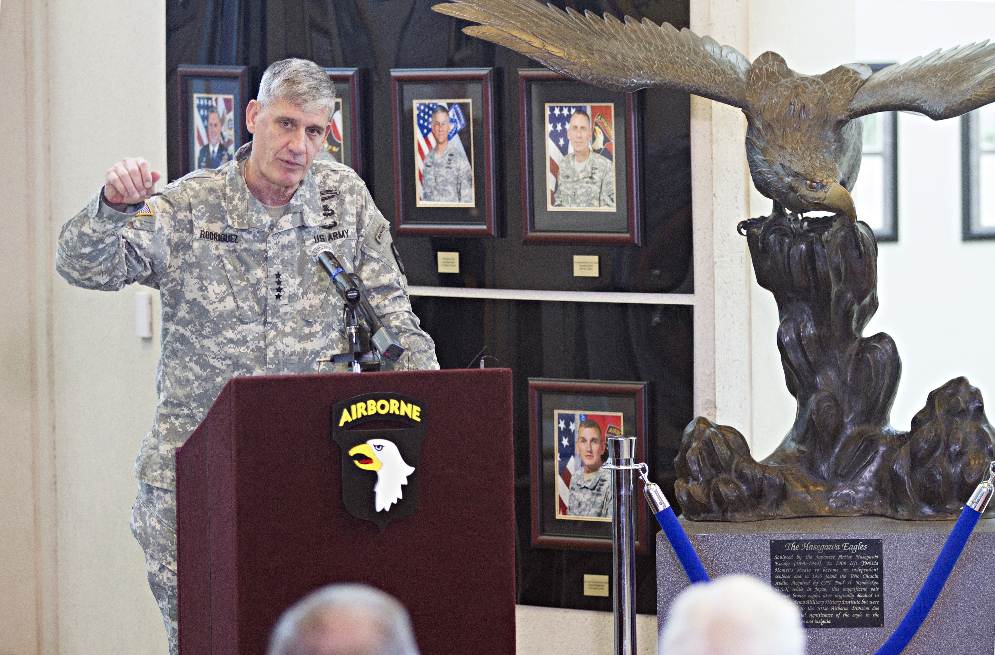 Gen. David M. Rodriguez, commanding general, U.S. Africa Command, speaks to the crowd during the Joint Meritorious Unit Award presentation ceremony at McAuliffe Hall August 27, 2015. The JMUA, the second most prestigious award a unit can receive, was presented to the 101st Airborne Division for their humanitarian mission during the Ebola epidemic in Liberia. (U.S. Army photo by Sgt. William White, 101st Airborne Division Public Affairs)
