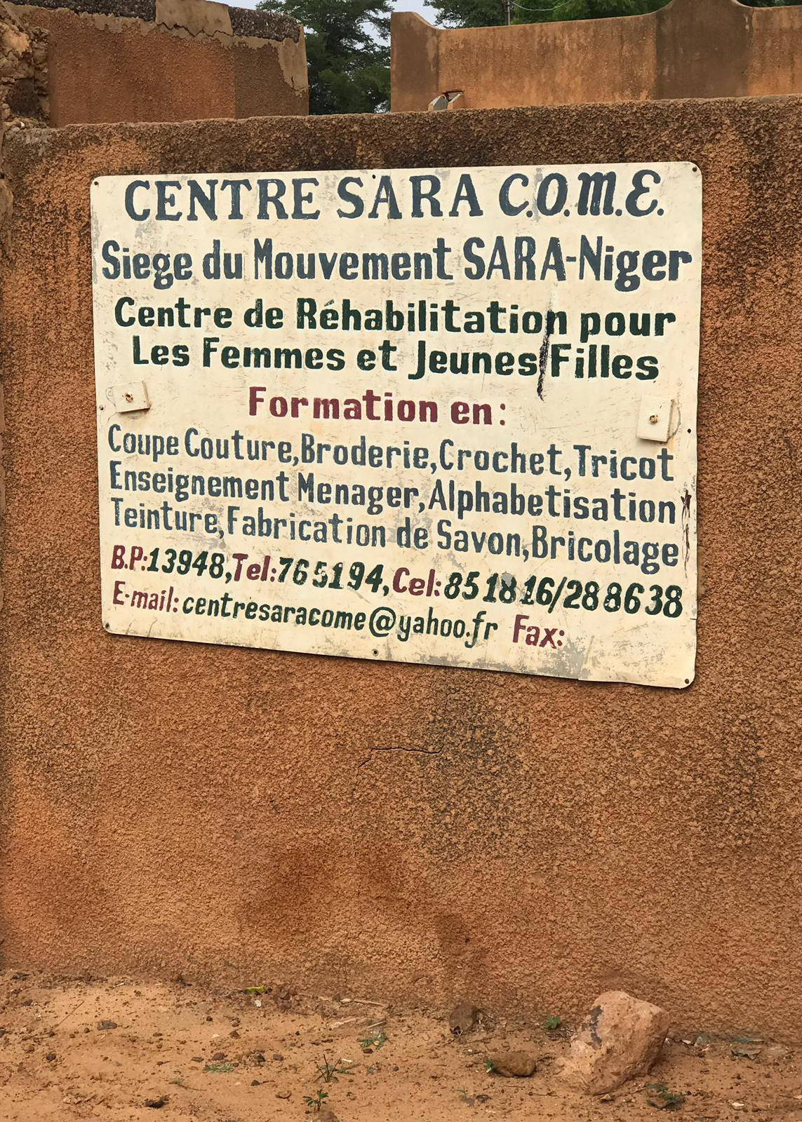 Pictured is the sign for the Sara-Niger Rehabilitation Center Movement for Women and Girls in Niamey, Niger. From Sept. 21 to Oct. 14, 2019, Airmen deployed to Nigerien Air Base 101 and U.S. Embassy personnel renovated the local women’s vocational school that teaches local women techniques for making clothing, providing them with a profession and a source of income. (Courtesy Photo)