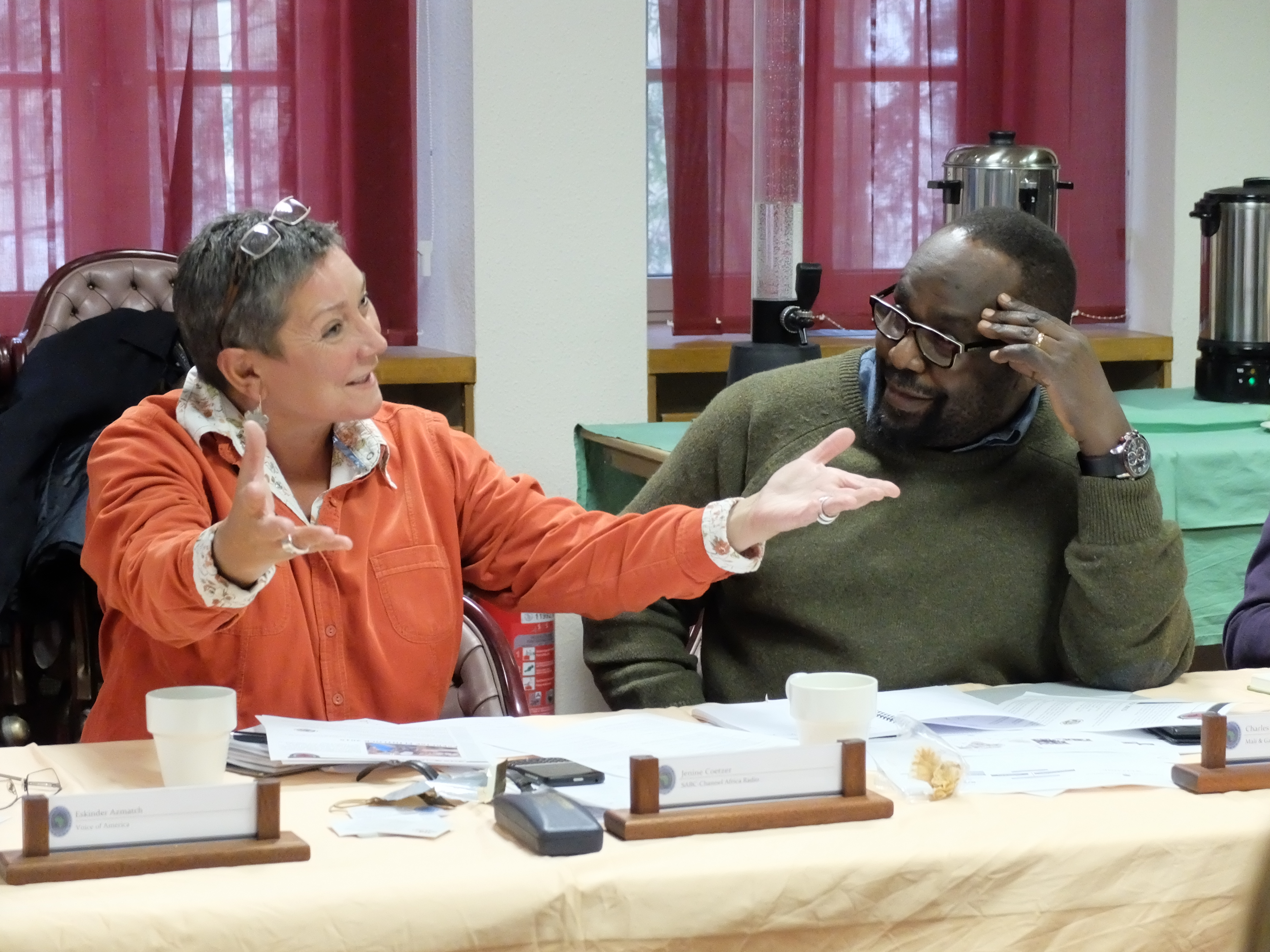 AU journalists, Jenine Coetzer (left), responds to a comment as Charles Obbo looks on during a media delegation visit, Feb. 9, 2015, at Kelley Barracks, U.S. Army Garrison, Stuttgart, Germany. Eight journalists, who are accredited with the African Union, are here as participants of a U.S. AFRICOM-sponsored media delegation visit to learn about the command's mission and programs. (Photo by Brenda Law/U.S. Africa Command Public Affairs/Released)