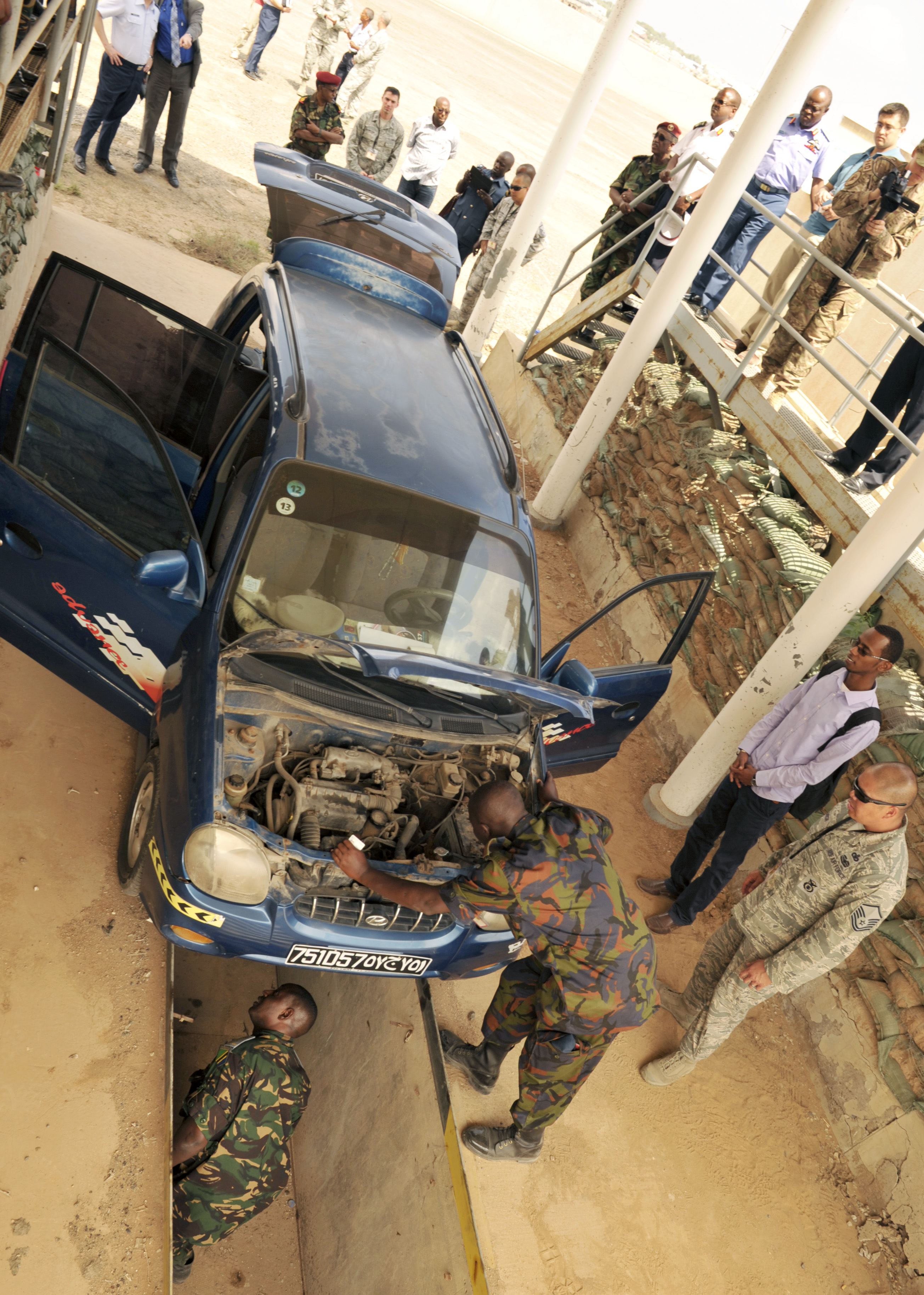 Kenya and Tanzania air force members conduct a vehicle inspection as part of an installation security knowledge exchange during African Partnership Flight–Djibouti at Djibouti Air Base, Feb. 9, 2015. APF is the premiere program to bring together partner nations to increase cooperation and interoperability, which fosters stability and security throughout the continent. (U.S. Air Force Photo by Tech. Sgt. Ian Dean)