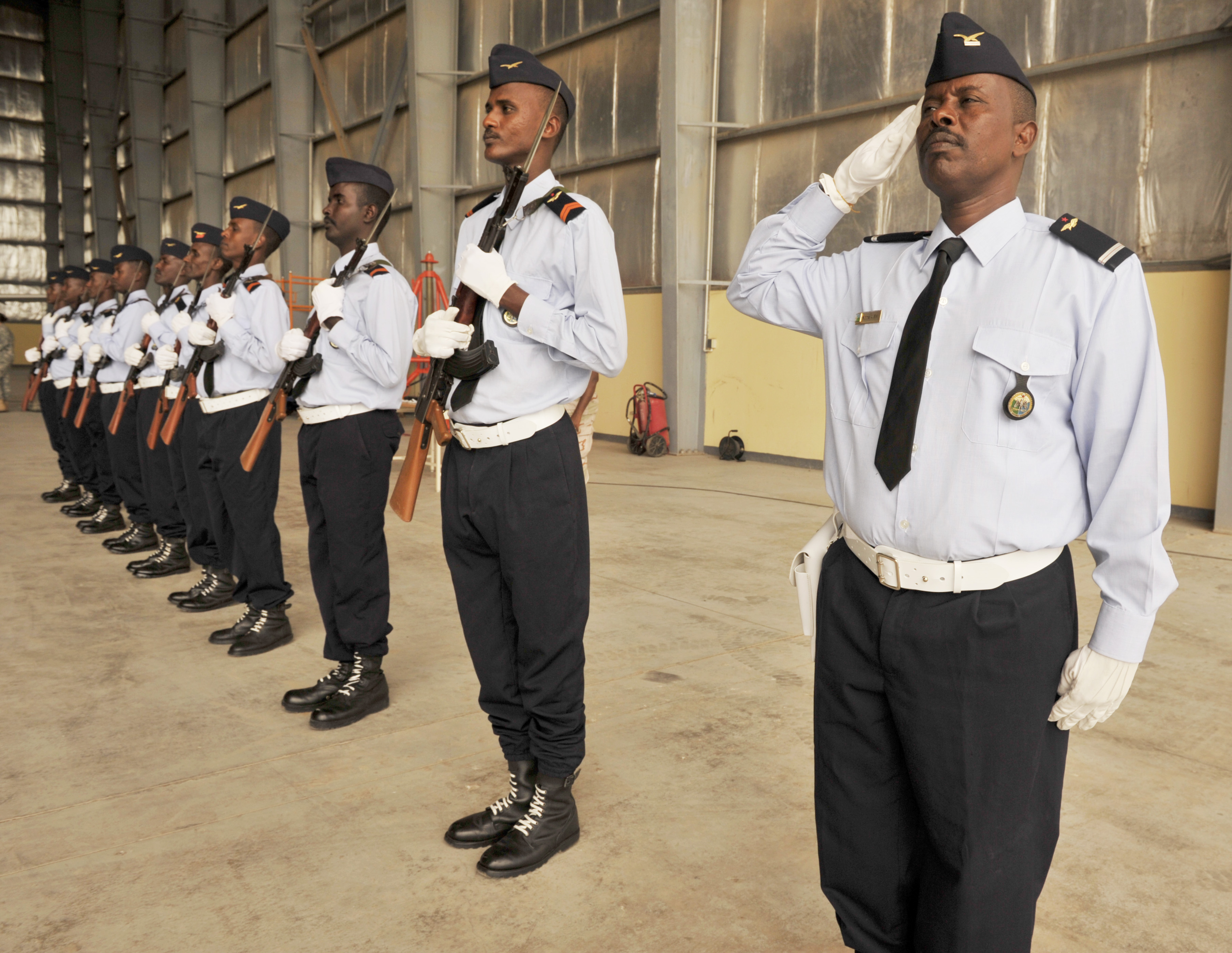 Members of the Djibouti air force honor guard render a salute during the closing ceremony for African Partnership Flight–Djibouti at Djibouti Air Base, Feb. 9, 2015. APF is the premiere program to bring together partner nations to increase cooperation and interoperability, which fosters stability and security throughout the continent. (U.S. Air Force Photo by Tech. Sgt. Ian Dean)