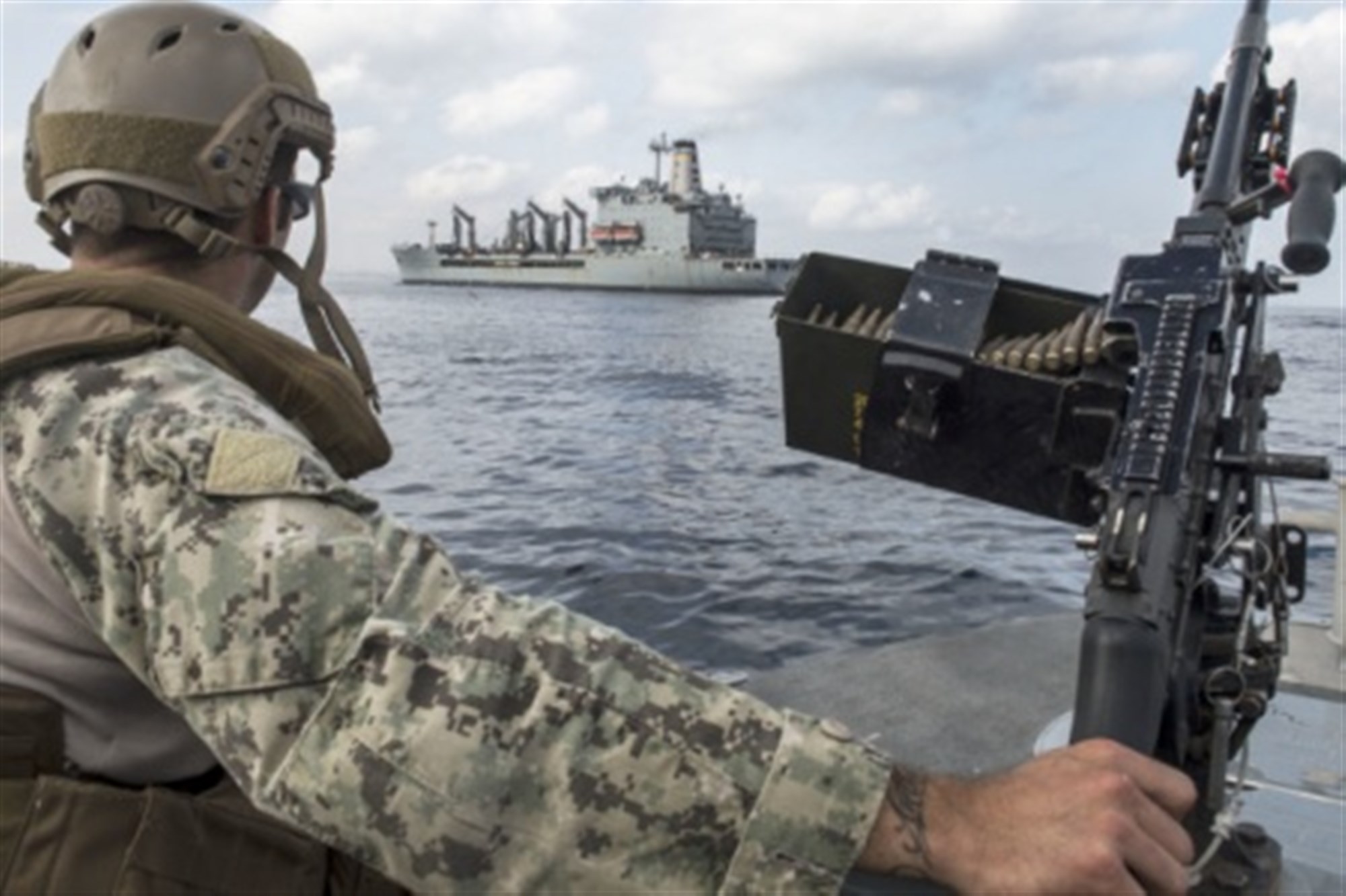 “Providing security for the ships that are here is vitally important. We’re here to provide an over watch for the guys that are coming here,” said U.S. Navy Boatswain Mate 1st Class Anthony Al-Russan, Tactical Craft Crewman and Gunner. “They’re coming here dropping off supplies here for the camp. They are also picking up supplies to take out to the fleet, to keep our U.S. Navy warships afloat and underway.”