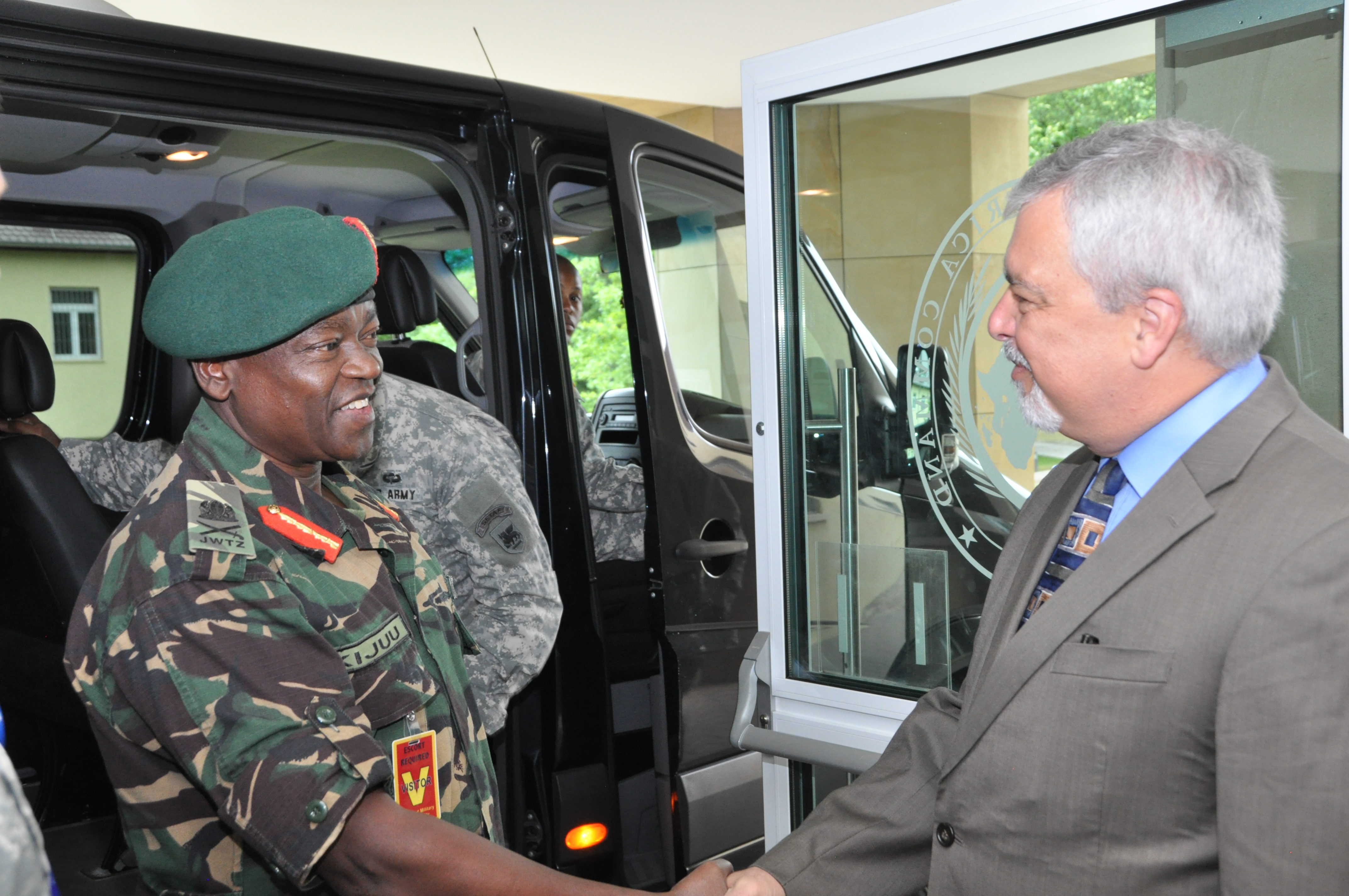 Ambassador Phillip Carter, III, deputy to the commander for civil-military engagement, greets Maj. Gen. Salim Mustafa Kijuu, land force commander of the Tanzanian People's Defence Force, during of a command sponsored visit coordinated by U.S. Army Africa July 8, 2015.