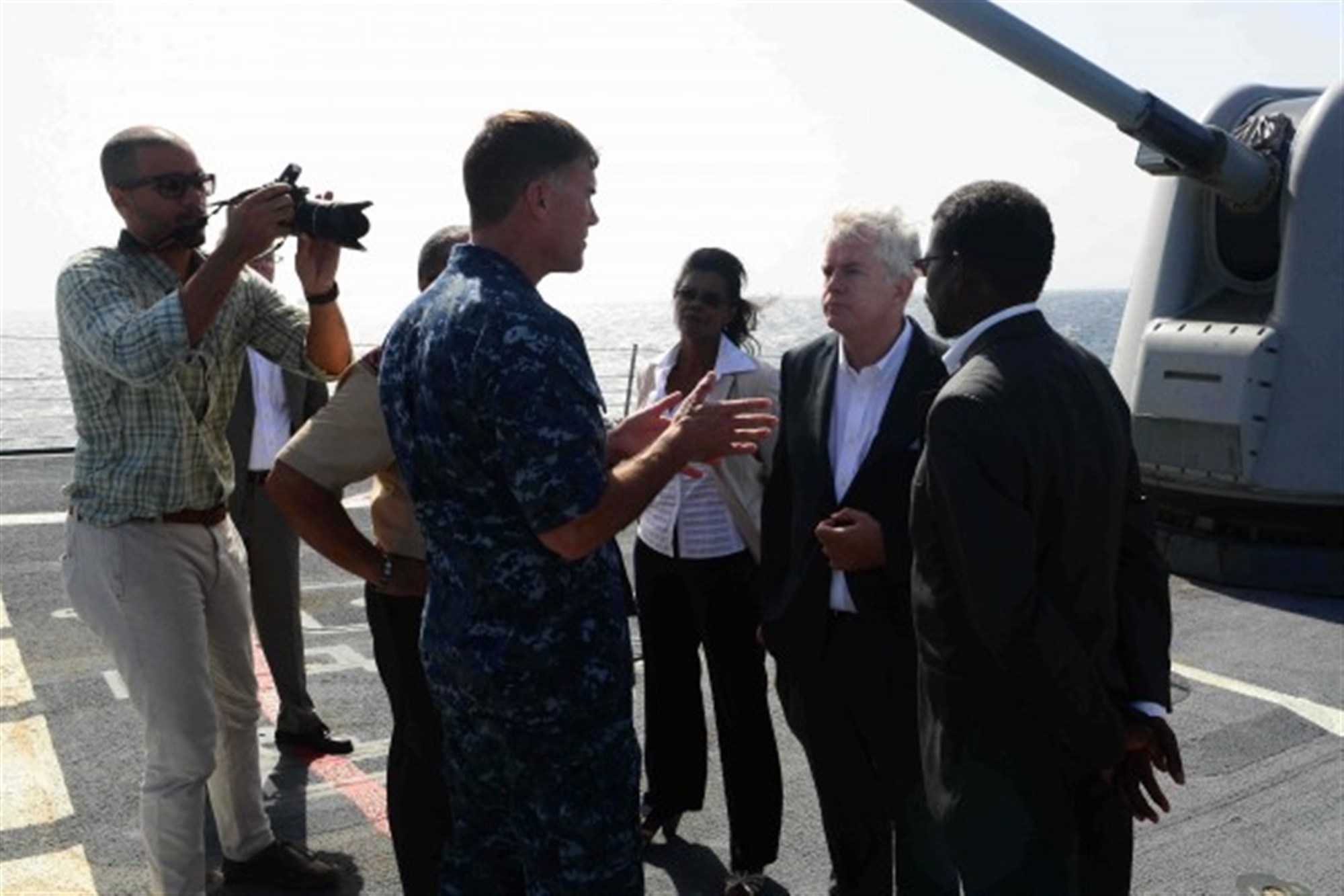 PRAIA, Cape Verde (Nov. 5, 2015) Cmdr. Michael J. Gunther, commanding officer of the Arleigh Burke Class guided-missile destroyer USS McFaul (DDG 74), showcases the ship’s forecastle during a tour with U. S. Ambassador to Cape Verde, Donald Heflin and Mr. Rui Semedo, Cape Verdean Minister of Parliamentary Affairs. McFaul is deployed to the U.S. 6th Fleet area of operations in order to advance security and stability in Europe. (U.S. Navy photo by Mass Communication Specialist 3rd Class Nicholas Frank Cottone/RELEASED)