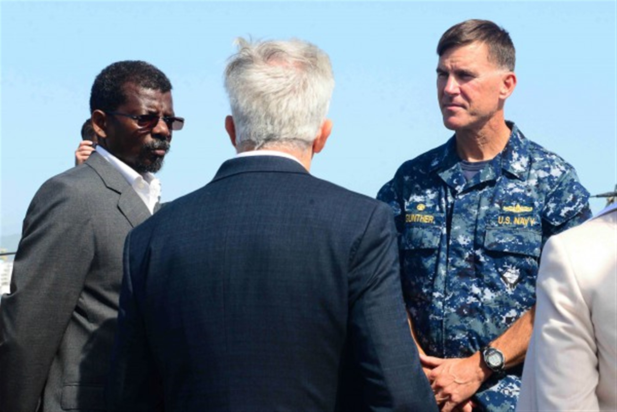 PRAIA, CAPE VERDE (Nov. 5, 2015) – U. S. Ambassador to Cape Verde, Donald Heflin and Mr. Rui Semedo, Cape Verdean Minister of Parliamentary Affairs, confer with Cmdr. Michael J. Gunther, commanding officer of the guided-missile destroyer USS McFaul (DDG 74). McFaul is deployed to the U.S. 6th Fleet area of operations in order to advance security and stability in Europe. (U.S. Navy photo by Mass Communication Specialist 3rd Class Nicholas Frank Cottone/RELEASED)