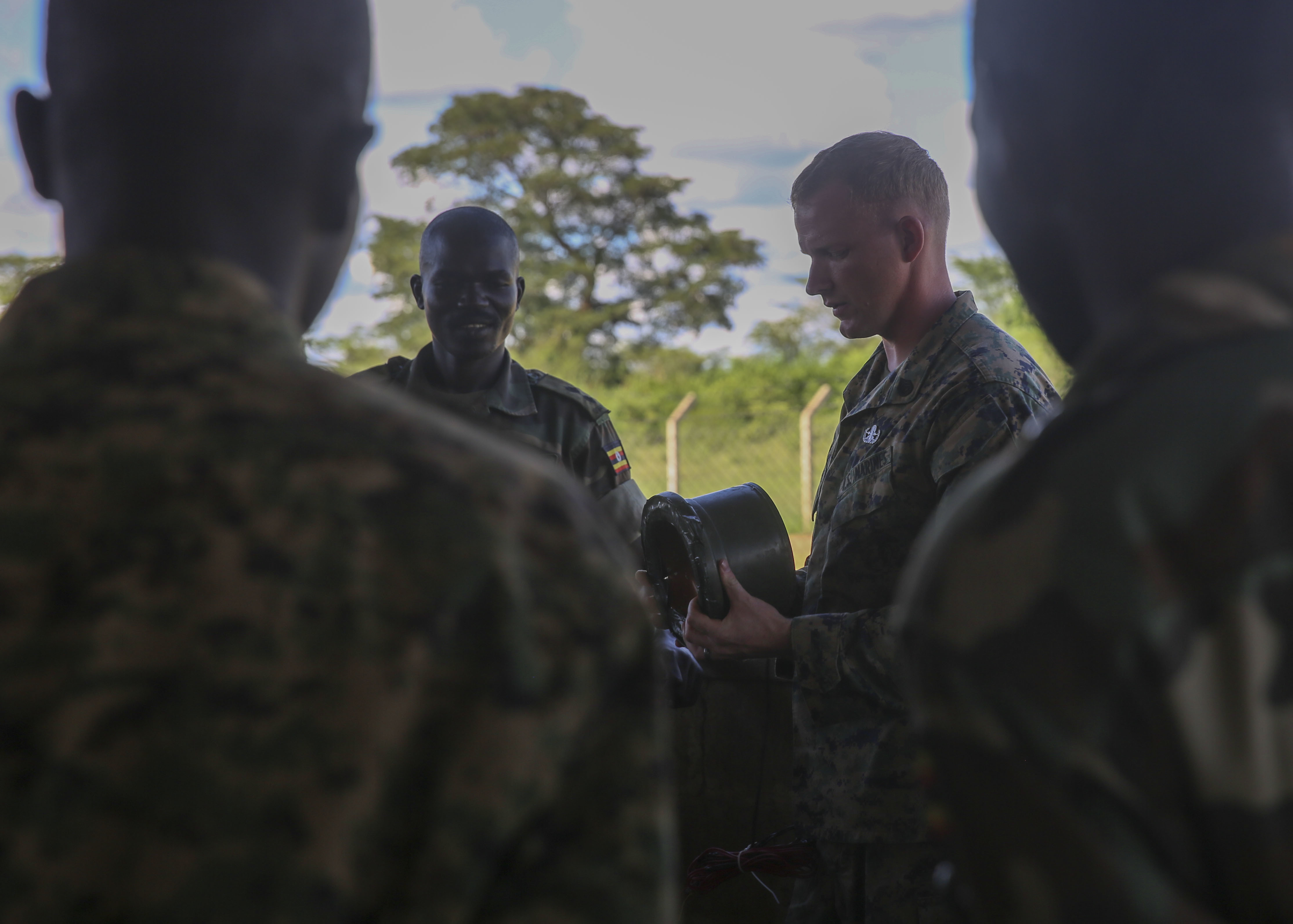 U.S. Marine Staff Sgt. Malachi McPherson, an explosive ordnance disposal technician with Special-Purpose Marine Air-Ground Task Force Crisis Response-Africa, shows some of the different types of improvised explosive devices to members of the Uganda People’s Defense Force during an IED awareness class at Camp Singo, Uganda, Nov. 2, 2015. Marines and sailors with SPMAGTF-CR-AF are training with the UPDF to increase engineering and logistical capabilities while strengthening the bonds between the partner counties. (U.S. Marine Corps photo by Cpl. Olivia McDonald/Released)