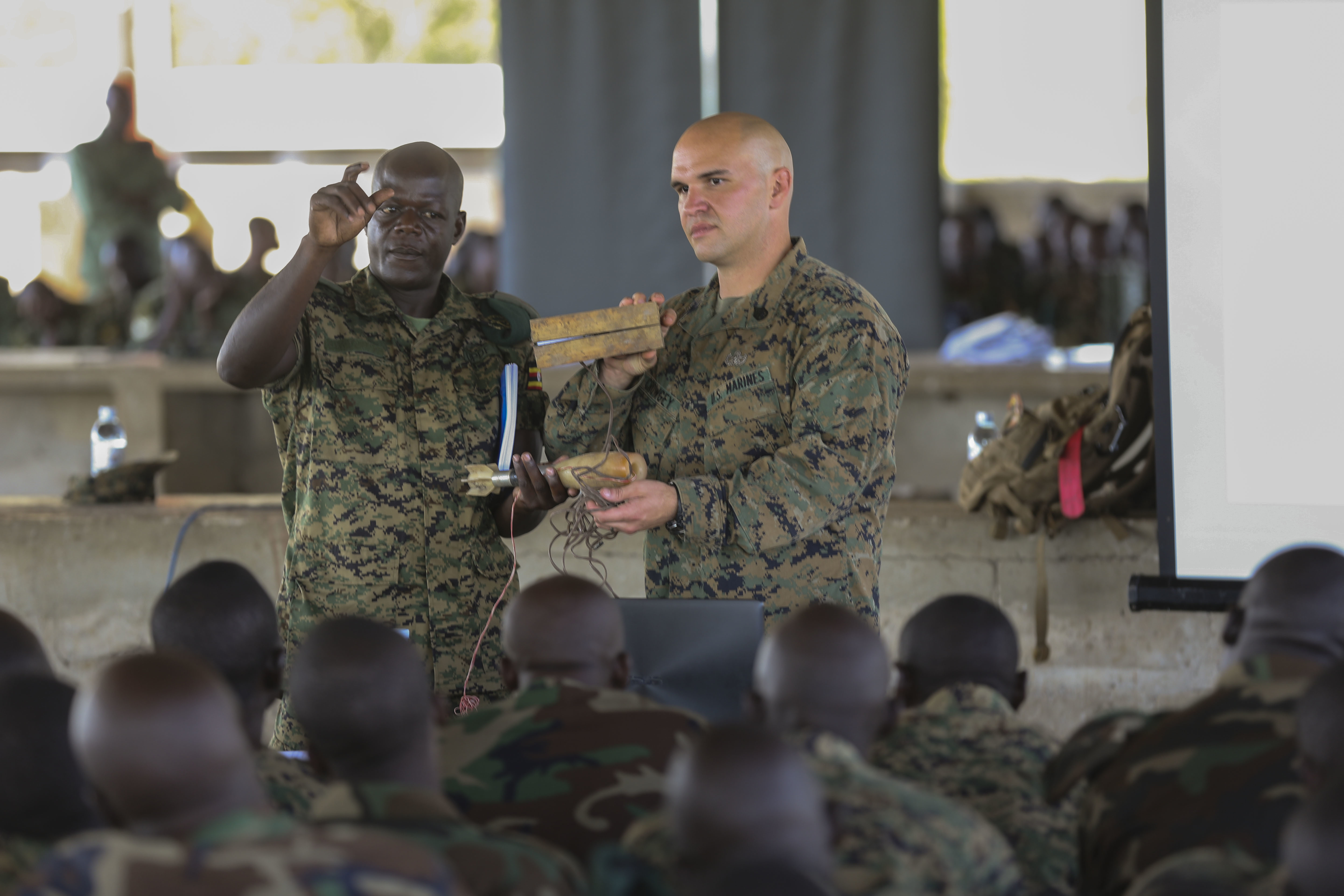 U.S. Marine Staff Sgt. Evan Crowgey, an explosive ordnance disposal technician with Special-Purpose Marine Air-Ground Task Force Crisis Response-Africa, conducted an improvised explosive device awareness class with the Uganda People’s Defense Force at Camp Singo, Uganda, Nov. 2, 2015. Marines and sailors with SPMAGTF-CR-AF are training with the UPDF to increase engineering and logistical capabilities while strengthening the bonds between the partner counties. (U.S. Marine Corps photo by Cpl. Olivia McDonald/Released)