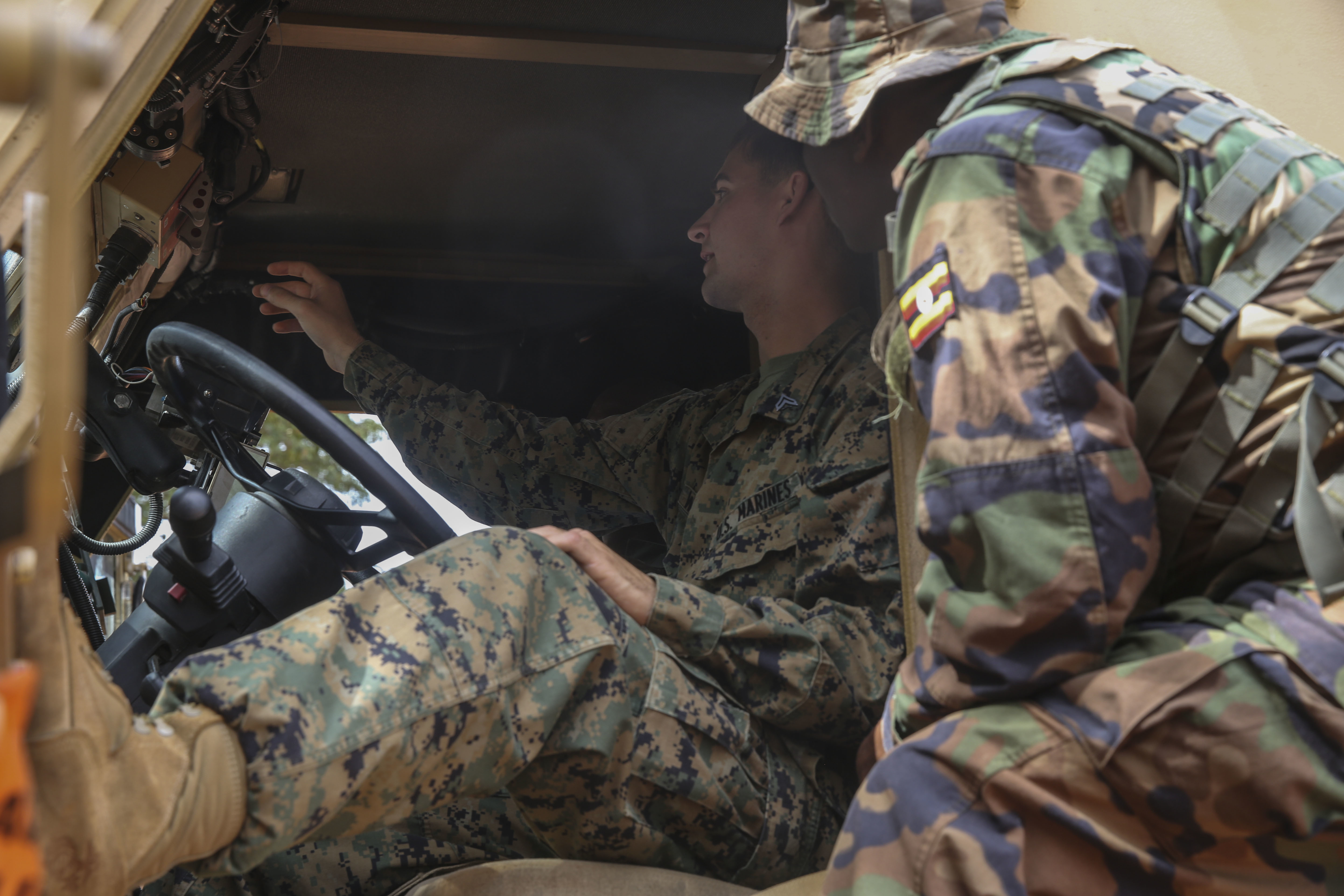 U.S. Marines with Special-Purpose Marine Air-Ground Task Force Crisis Response-Africa, train members of the Uganda People’s Defense Force on Mine-Resistant, Ambushed-Protected Vehicles, or MRAPs, at Camp Singo, Uganda, Nov. 3, 2015. Marines and sailors with SPMAGTF-CR-AF are training with the UPDF to increase engineering and logistical capabilities while strengthening the bonds between the partner countries. (U.S. Marine Corps photo by Cpl. Olivia McDonald/Released)
