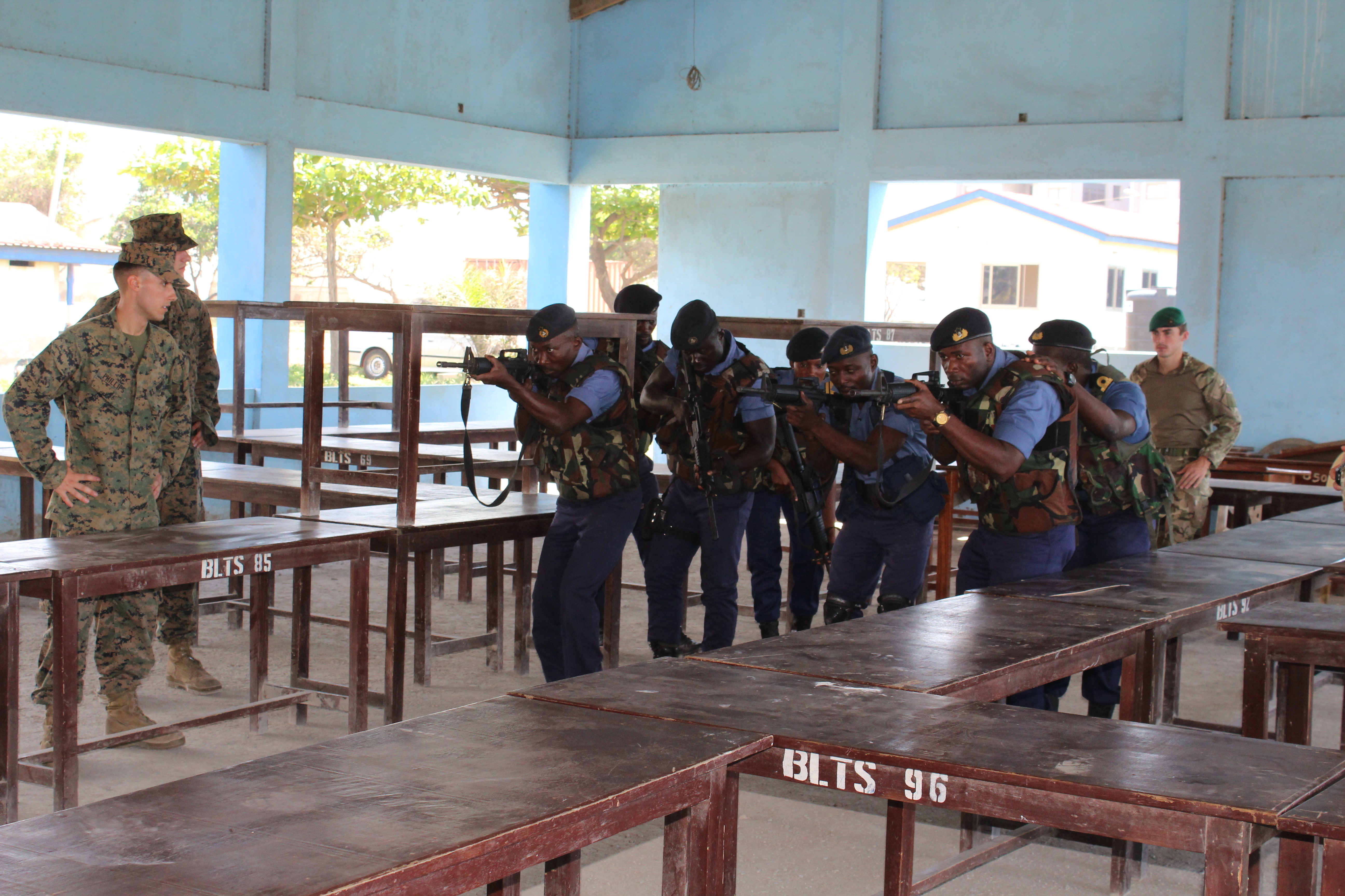 U.S. Marines and U.K. Royal Marine Commandos teach Ghanaian Navy sailors room-clearing techniques, Oct. 22, in Sekondi, Ghana. U.S. Marines and U.K. Royal Marine Commandos trained the Ghanaian Navy sailors as part of the Africa Partnership Station, which is a U.S. Naval Forces Africa initiative that aims to increase the maritime safety and security capacity of African partners through collaboration and regional cooperation through engagement exercises that build toward self-sustained African security of the maritime domain.