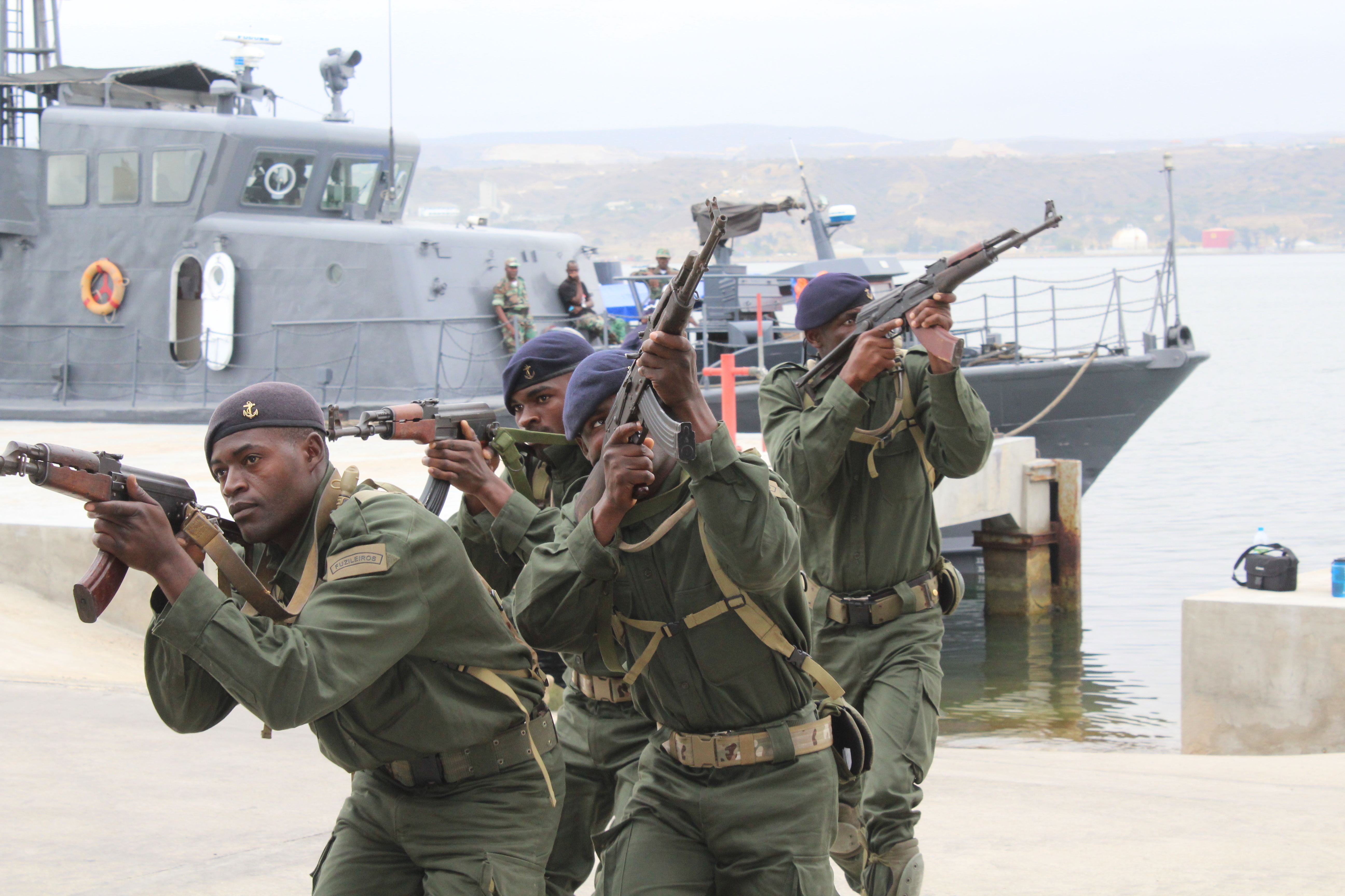 Angola's Fuzileiros Operaçües Especiais Marines prepare to clear buildings after disembarking a boat during room-clearing training, Oct. 7, in Lobito, Angola. U.S. Marines and U.K. Royal Marine Commandos trained the Fuzileiros Operaçües Especiais Marines as part of the Africa Partnership Station, which is a U.S Naval Forces Africa initiative that aims to increase the maritime safety and security capacity of African partners through collaboration, regional cooperation through engagement exercises that build toward self-sustained African security of the maritime domain.