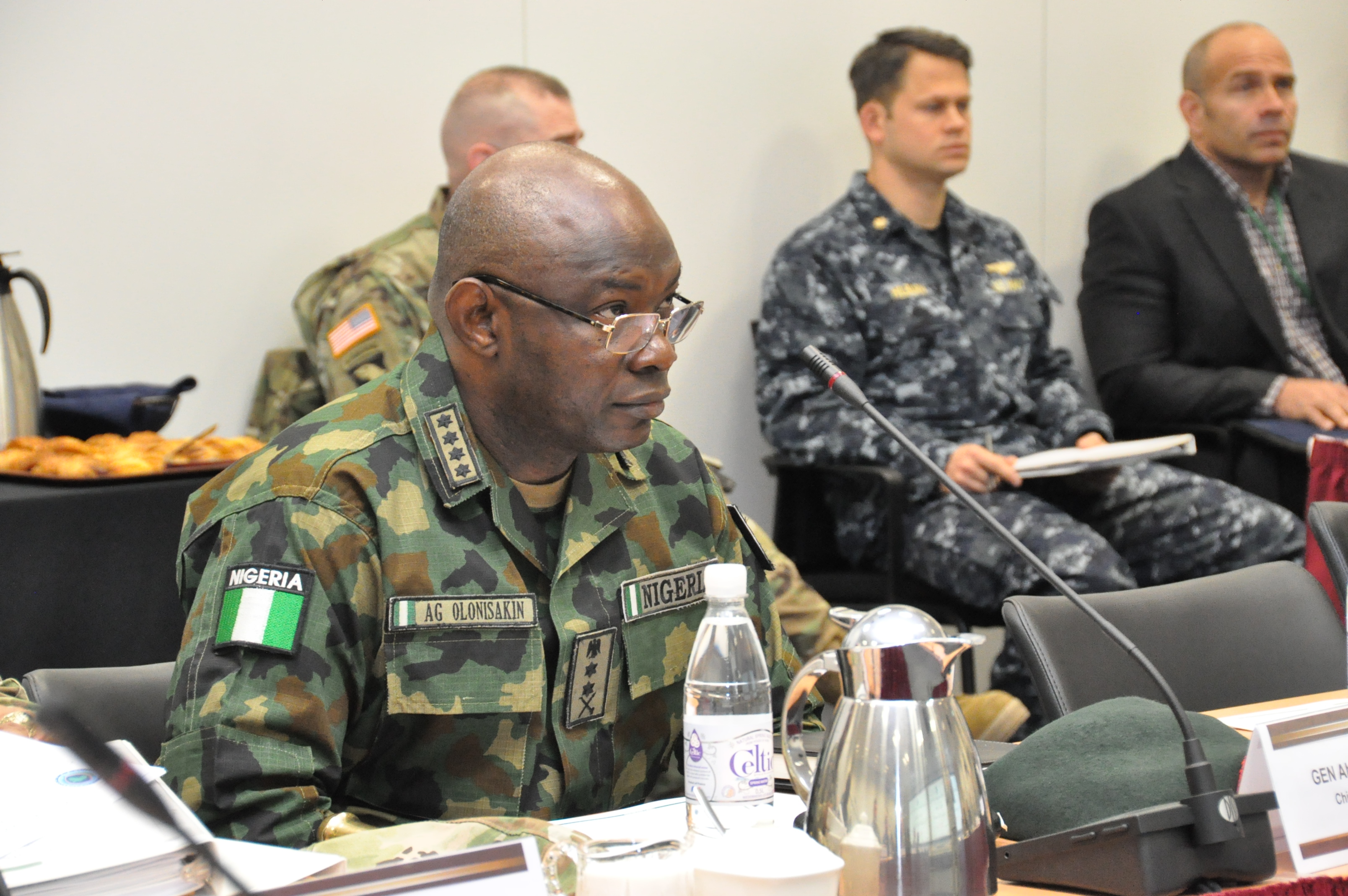 Gen. Abayomi Olonisakin, Nigeria chief of defence staff, listens as Gen. David Rodriguez, commander, U.S. Africa Command delivers opening remarks for a two-day meeting with senior AFRICOM commanders and leaders. The purpose of the visit was to reinforce the importance of a strong US-Nigeria security cooperation relationship, with topics focused on ways to counter terrorism, joint operations, logistics and maritime security in the Gulf of Guinea, Feb. 9, 2016, U.S. Army Garrison Stuttgart, Germany. (Photo by Brenda Law, U.S. Africa Command Public Affairs/RELEASED)