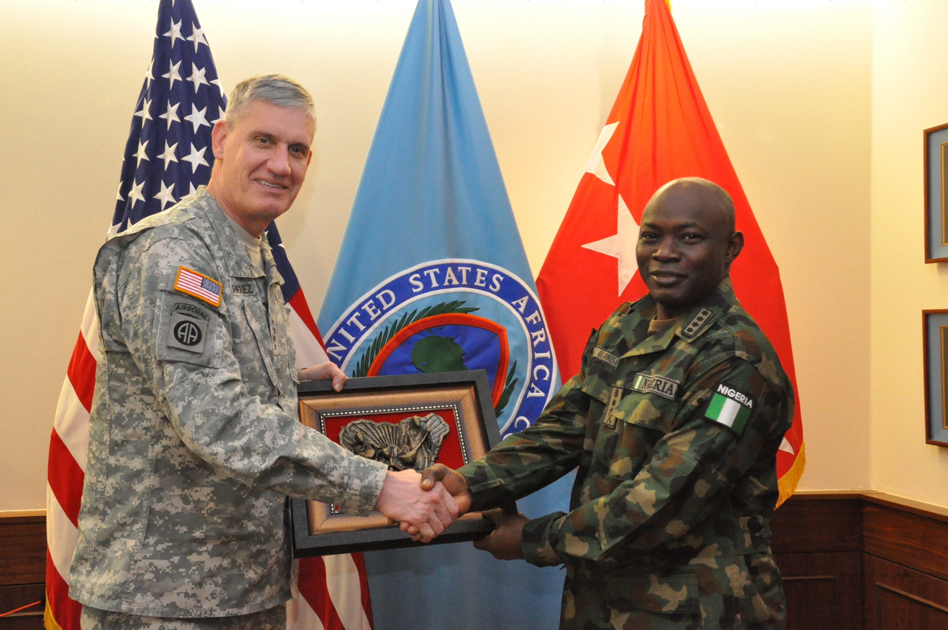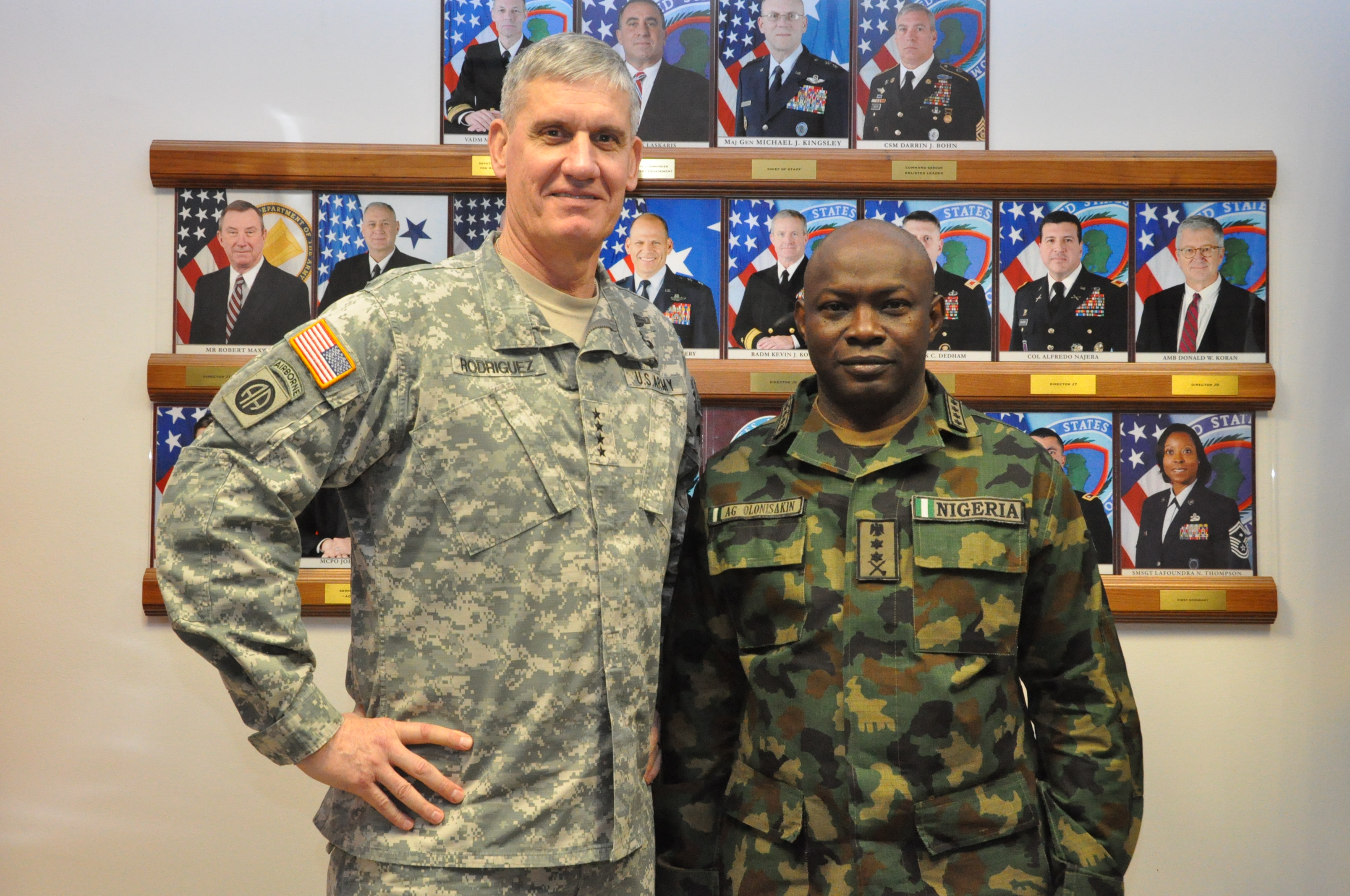Nigeria Chief of Defence Staff, Gen. Abayomi Olonisakin (right) and the Commander, U.S. Africa Command, Gen. David Rodriguez, pose for a photo. AFRICOM hosted a two-day meeting that brought together the component commanders and several senior members of the Nigerian military. The purpose of the visit was to reinforce the importance of a strong US-Nigeria security cooperation relationship, with topics focused on ways to counter terrorism, joint operations, logistics and maritime security in the Gulf of Guinea, Feb. 9, 2016, U.S. Army Garrison Stuttgart, Germany. (Photo by Brenda Law, U.S. Africa Command Public Affairs/RELEASED)