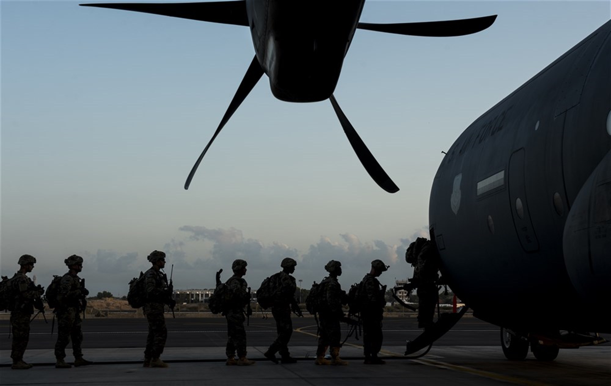 The pallets and dozens of infantrymen were loaded onto a C-130J Super Hercules from the 75th Expeditionary Airlift Squadron, deployed from Dyess Air Force Base, Texas. Within minutes of being fully loaded, the aircraft was preparing for takeoff.