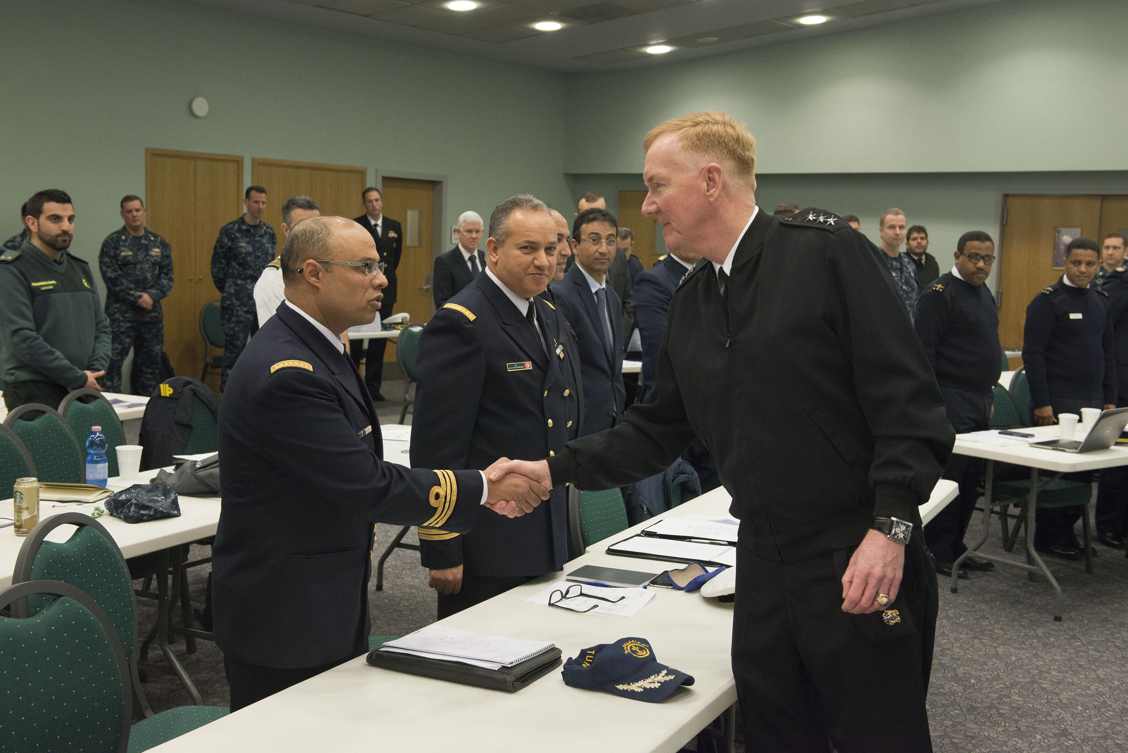 160307-N-OX801-025 NAVAL SUPPORT ACTIVITY NAPLES, Italy (March 7, 2016) Commander, U.S. 6th Fleet, Vice Adm. James Foggo III, right, welcomes attending senior leaders from maritime forces at the Phoenix Express 2016 planning conference at Naval Support Activity Naples, Italy, March 7, 2016. U.S. 6th Fleet, headquartered in Naples, Italy, conducts the full spectrum of joint and naval operations, often in concert with allied, joint, and interagency partner, in order to advance U.S. national interests and security and stability in Europe and Africa. (U.S. Navy photo by Mass Communication Specialist 2nd Class Daniel P. Schumacher/Released)