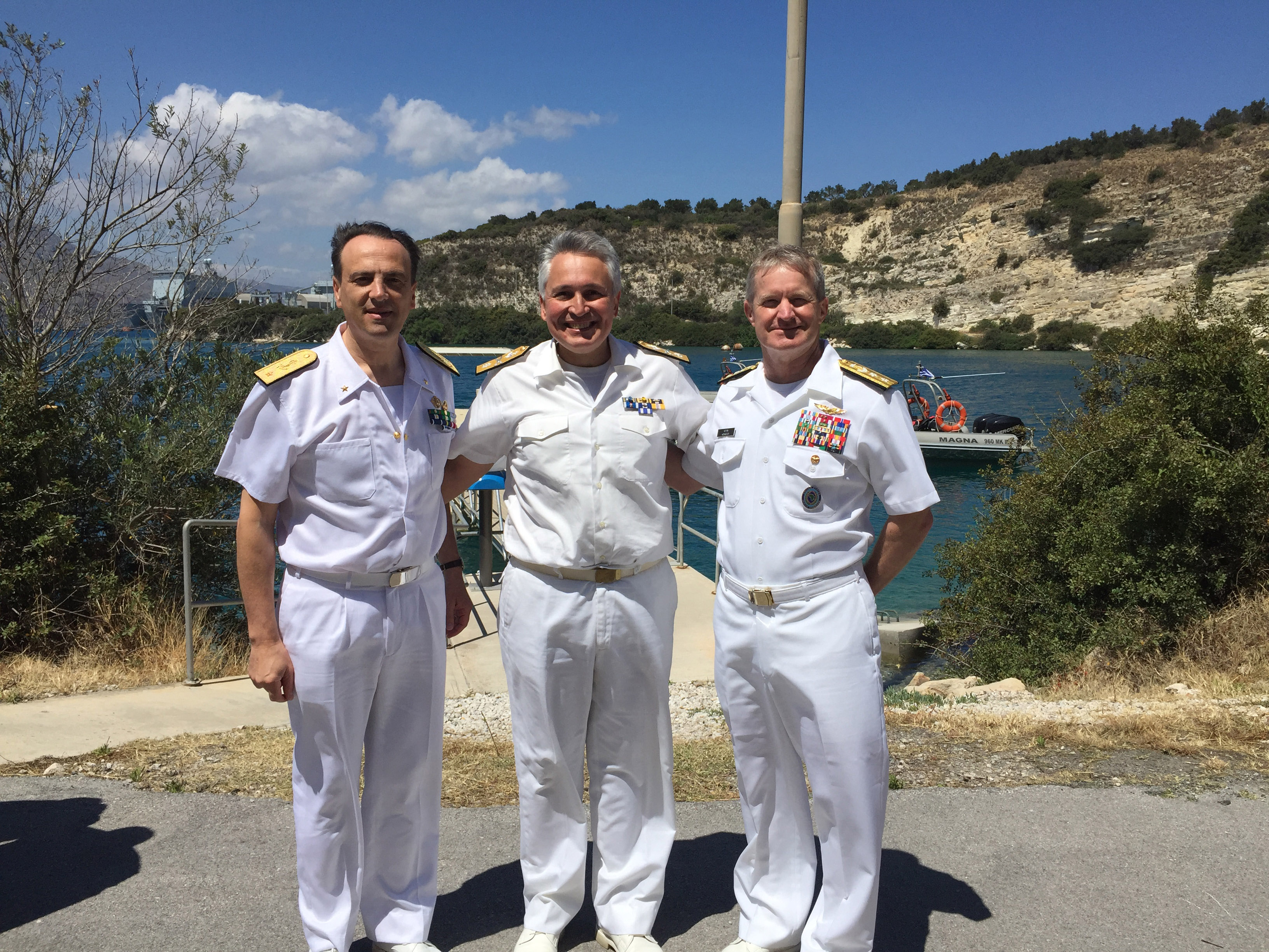 160517-N-VK993-001 SOUDA BAY, Greece (May 17, 2016) Rear Adm. Kevin Kovacich, Director of Strategy, Plans, and programs, U.S. Africa Command, and Italian Navy Rear Adm. Alberto Maffeis, Commander Patrol Forces Italy joined with Hellenic Navy Commodore Georgios Tsogkas, Commandant of NATO Maritime Interdiction Operational Training Center for a tour of Naval Support Activity Souda Bay as part of exercise Phoenix Express 2016 opening ceremony May 17. Phoenix Express 2016, sponsored and facilitated by U.S Africa Command, is designed to improve regional cooperation, increase maritime domain awareness, information-sharing practices, and operational capabilities to enhance efforts to achieve safety and security in the Mediterranean Sea. (U.S. Navy photo by Lieutenant Junior Grade Jill Brown/Released)