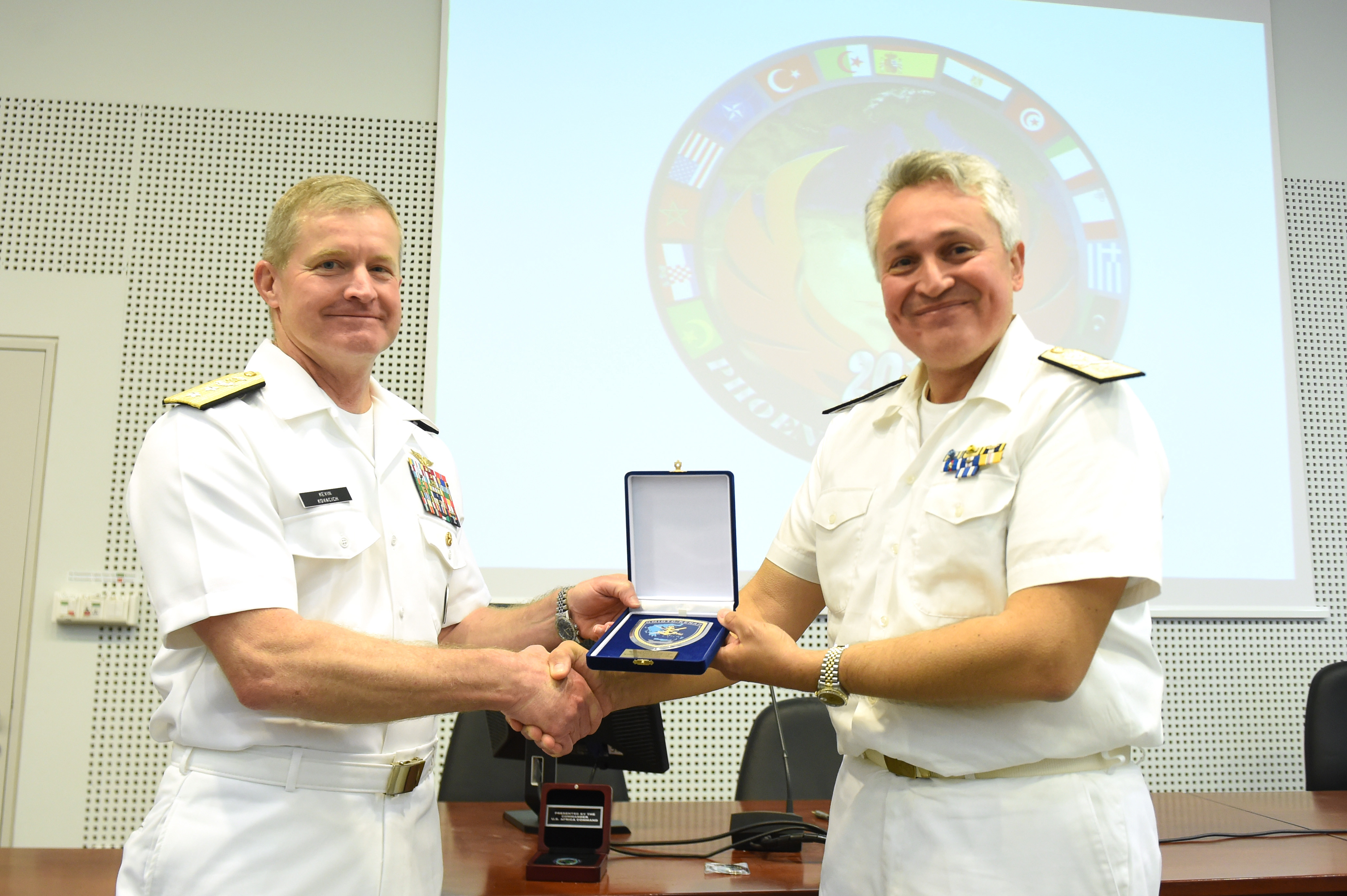 160517-N-XT273-415 SOUDA BAY, Greece (May 17, 2016) Rear Adm. Kevin J. Kovacich, Director of Strategy, Plans and Programs U. S. Africa Command, receives a gift from Hellenic Navy Commodore Georgics Tsogkas, NATO Maritime Interdiction Operations Training Center Commandant, during the opening ceremony of exercise Phoenix Express 2016, May 17. Phoenix Express 2016, sponsored and facilitated by U.S Africa Command, is designed to improve regional cooperation, increase maritime domain awareness, information-sharing practices, and operational capabilities to enhance efforts to achieve safety and security in the Mediterranean Sea. (U.S. Navy photo by Mass Communication Specialist 2nd Class Justin Stumberg/Released)