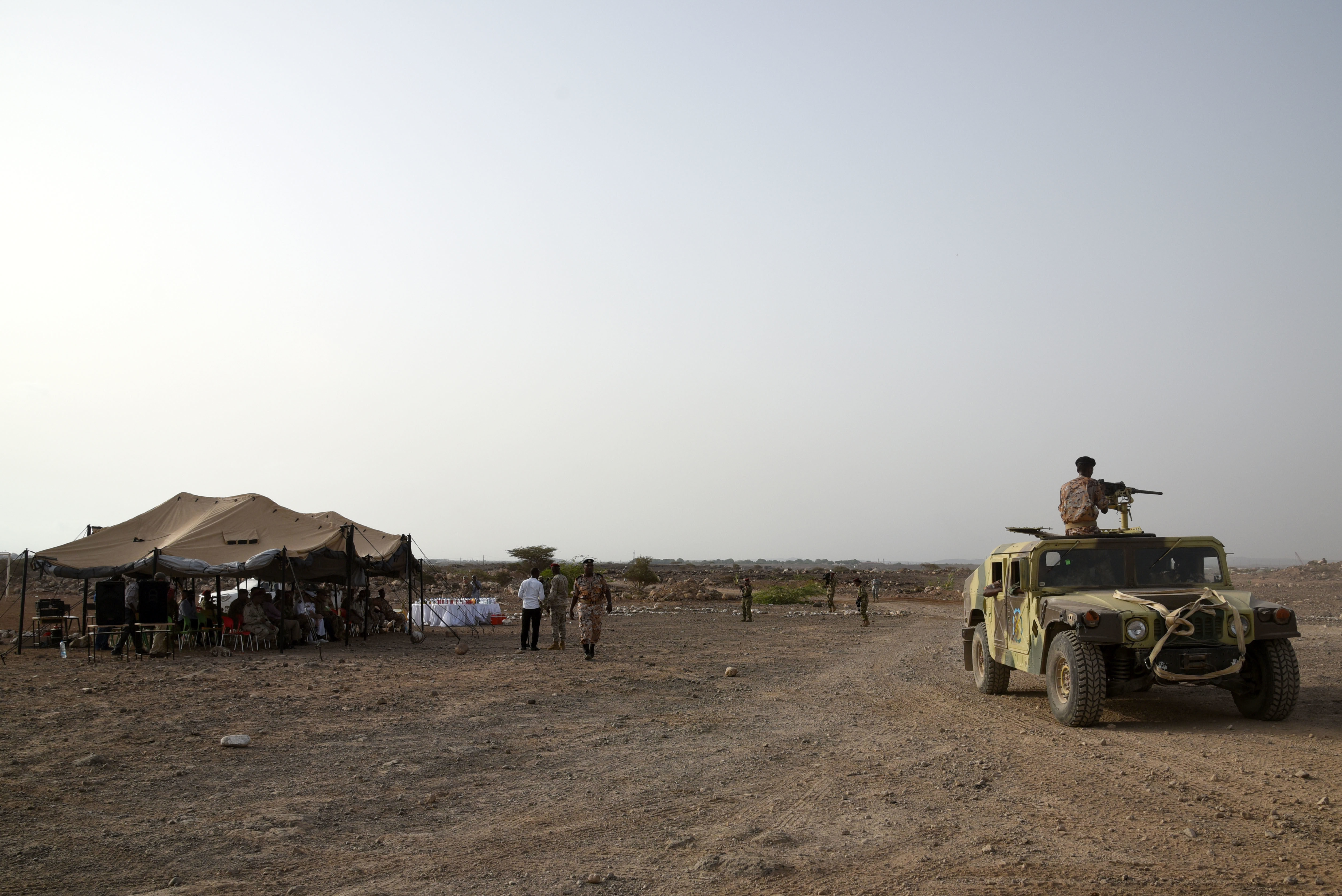 CAMP CHEIK OSMAN, Djibouti – Djiboutian Armed Forces (FAD) Soldiers prepare their Humvee for the final test after completing a five-month training course instructed by the U.S. Army Regionally Aligned Forces Soldiers, May 16, 2016, at Camp Cheik Osman, Djibouti. The FAD soldiers tested the skills they learned by demonstrating their reactions to various mock situations from convoying through a road block, identifying mock roadside bombs, medical care, and vehicle recovery. (U.S. Air Force photo by Staff Sgt. Tiffany DeNault/Released)