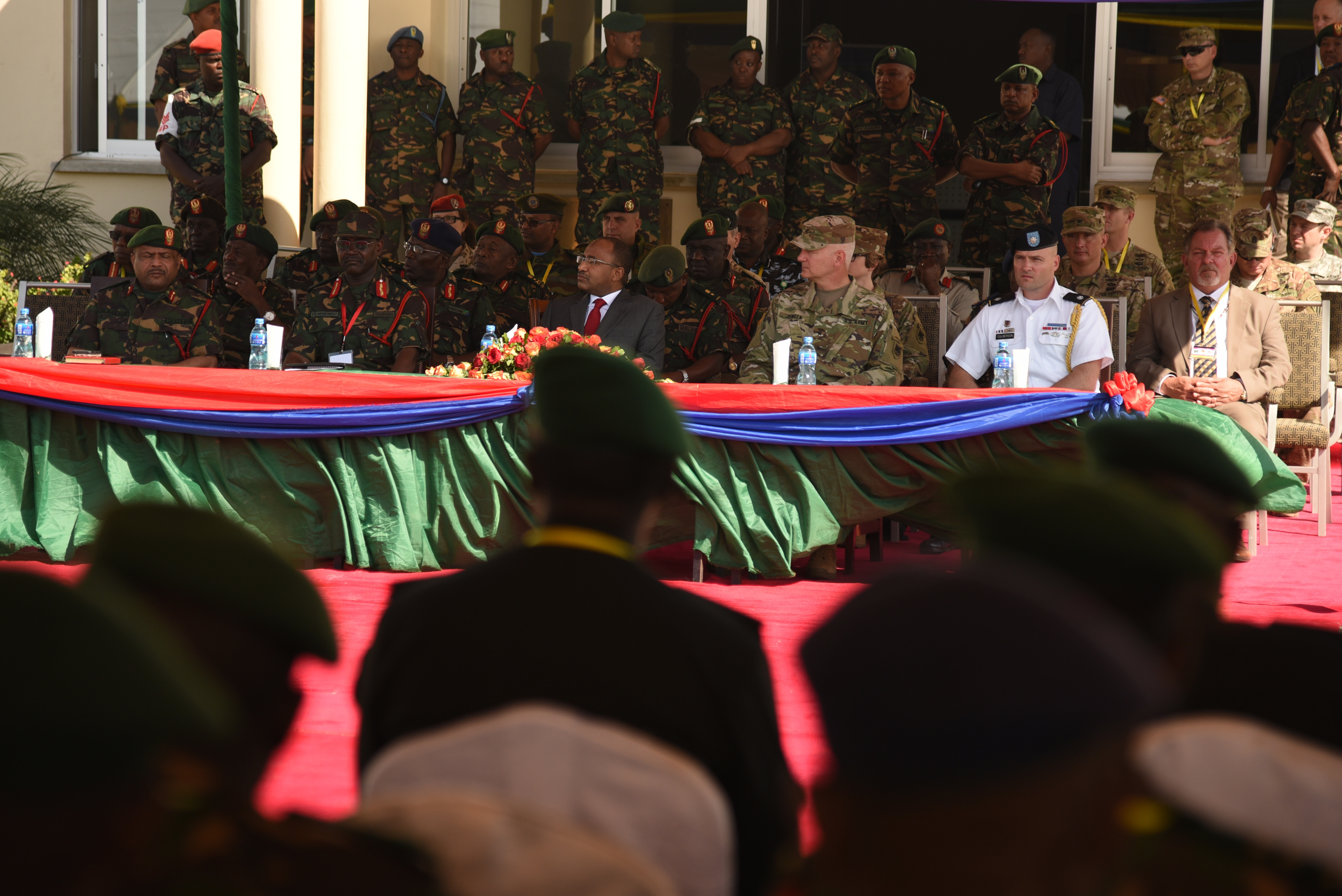 DAR ES SALAAM, Tanzania – Eastern Accord 2016 participants attend the Opening Ceremony to commence the command post exercise at the Tanzanian Peacekeeping Training Centre, July 11, 2016, in Dar es Salaam, Tanzania. EA16 is an annual, combined, joint military exercise that brings together partner nations to practice and demonstrate proficiency in conducting peacekeeping operations. (U.S. Air Force photo by Staff Sgt. Tiffany DeNault/Released)
