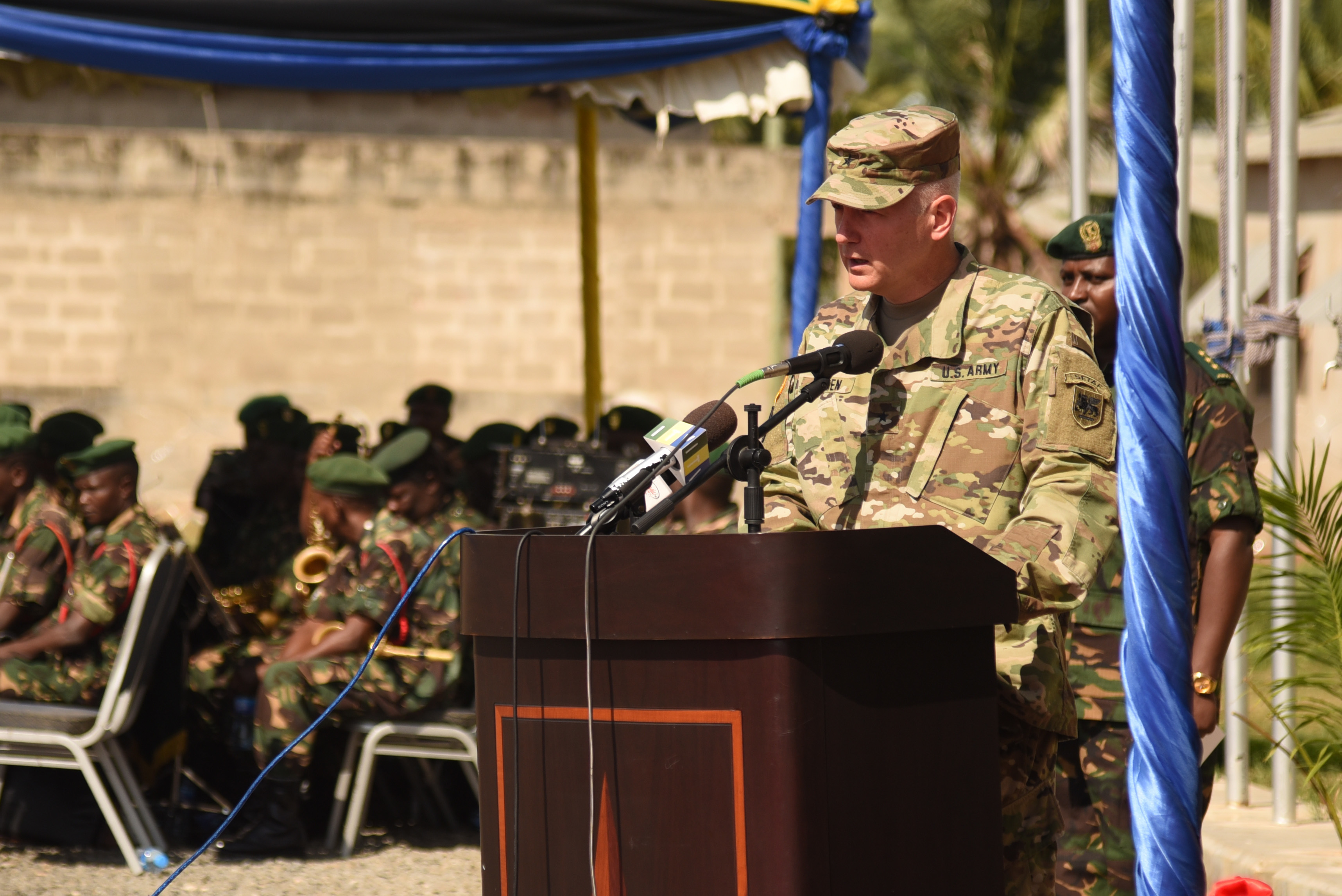 DAR ES SALAAM, Tanzania – U.S. Army Brig. Gen. Jon Jensen, U.S. Army Africa deputy commanding general and co-exercise director, welcomes participants to the Eastern Accord 2016 command post exercise during the opening ceremony at the Tanzanian Peacekeeping Training Centre on July, 11, 2016, Dar es Salaam, Tanzania. EA16 is an annual, combined, joint military exercise that brings together partner nations to practice and demonstrate proficiency in conducting peacekeeping operations. (U.S. Air Force photo by Staff Sgt. Tiffany DeNault/Released)