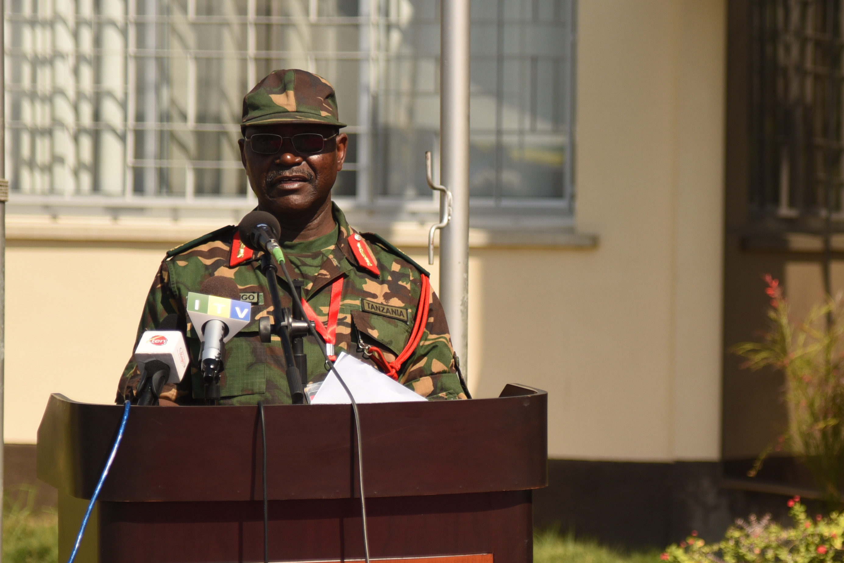 DAR ES SALAAM, Tanzania – Tanzanian Brig. Gen. Yohana Ocholla Mabongo, Eastern Accord 2016 exercise co-director, welcomes the participants to the Eastern Accord 2016 command post exercise during the Opening Ceremony at the Tanzanian Peacekeeping Training Centre on July, 11, 2016, in Dar es Salaam, Tanzania. EA16 is an annual, combined, joint military exercise that brings together partner nations to practice and demonstrate proficiency in conducting peacekeeping operations. (U.S. Air Force photo by Staff Sgt. Tiffany DeNault/Released)