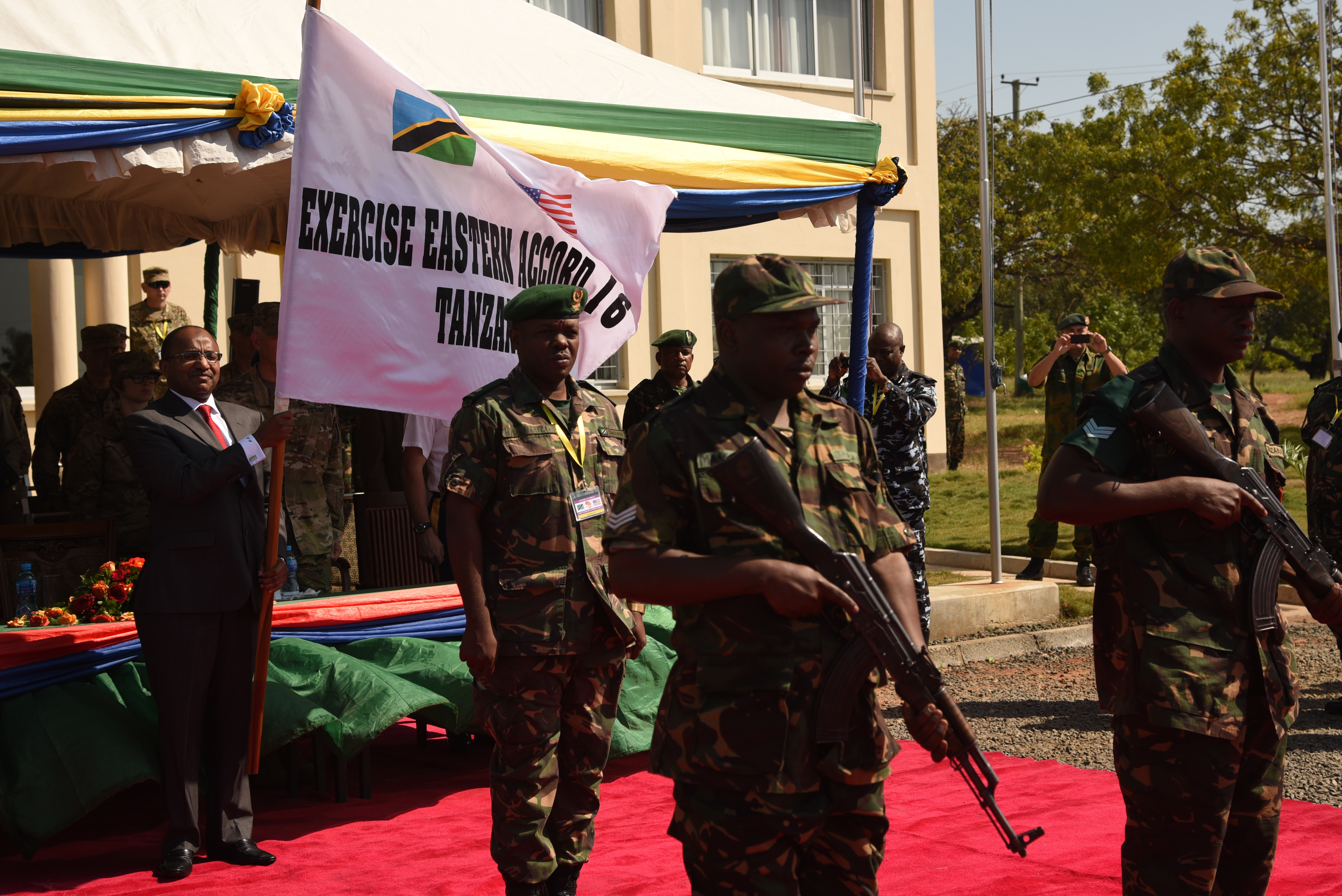 DAR ES SALAAM, Tanzania – Hussein Ali Mwyini, Minister of Defense and National Service, presents the Eastern Accord 2016 flag representing the commencement of the command post exercise the Tanzanian Peacekeeping Training Centre on July 11, 2016, in Dar es Salaam, Tanzania. EA16 is an annual, combined, joint military exercise that brings together partner nations to practice and demonstrate proficiency in conducting peacekeeping operations. (U.S. Air Force photo by Staff Sgt. Tiffany DeNault/Released)