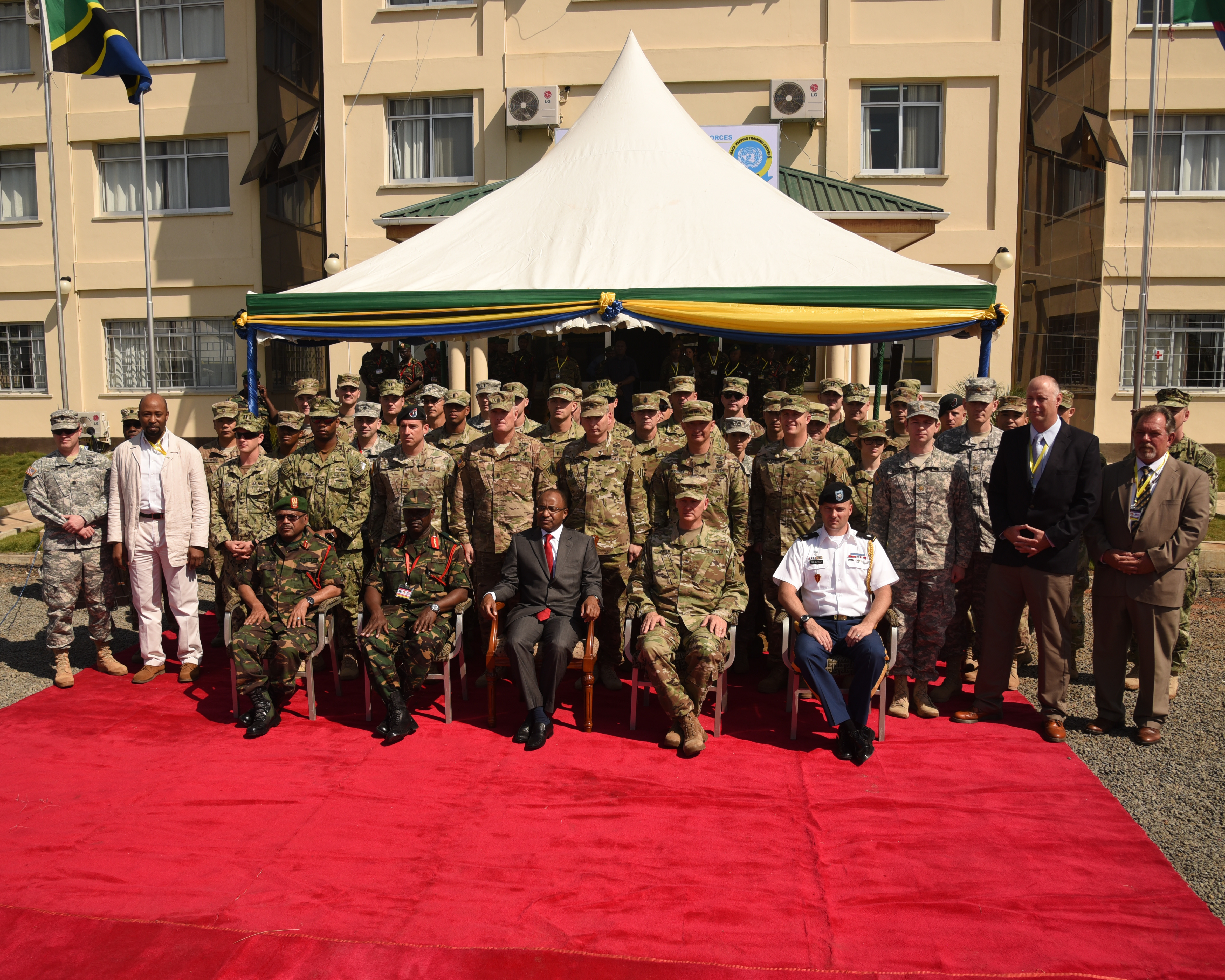 DAR ES SALAAM, Tanzania – Senior military leaders and Hussein Ali Mwyini, Minister of Defense and National Service, take a group photograph with the U.S. Eastern Accord 2016 participants at the Opening Ceremony at the Tanzanian Peacekeeping Training Centre on July 11, 2016, in Dar es Salaam, Tanzania. EA16 is an annual, combined, joint military exercise that brings together partner nations to practice and demonstrate proficiency in conducting peacekeeping operations. (U.S. Air Force photo by Staff Sgt. Tiffany DeNault/Released)