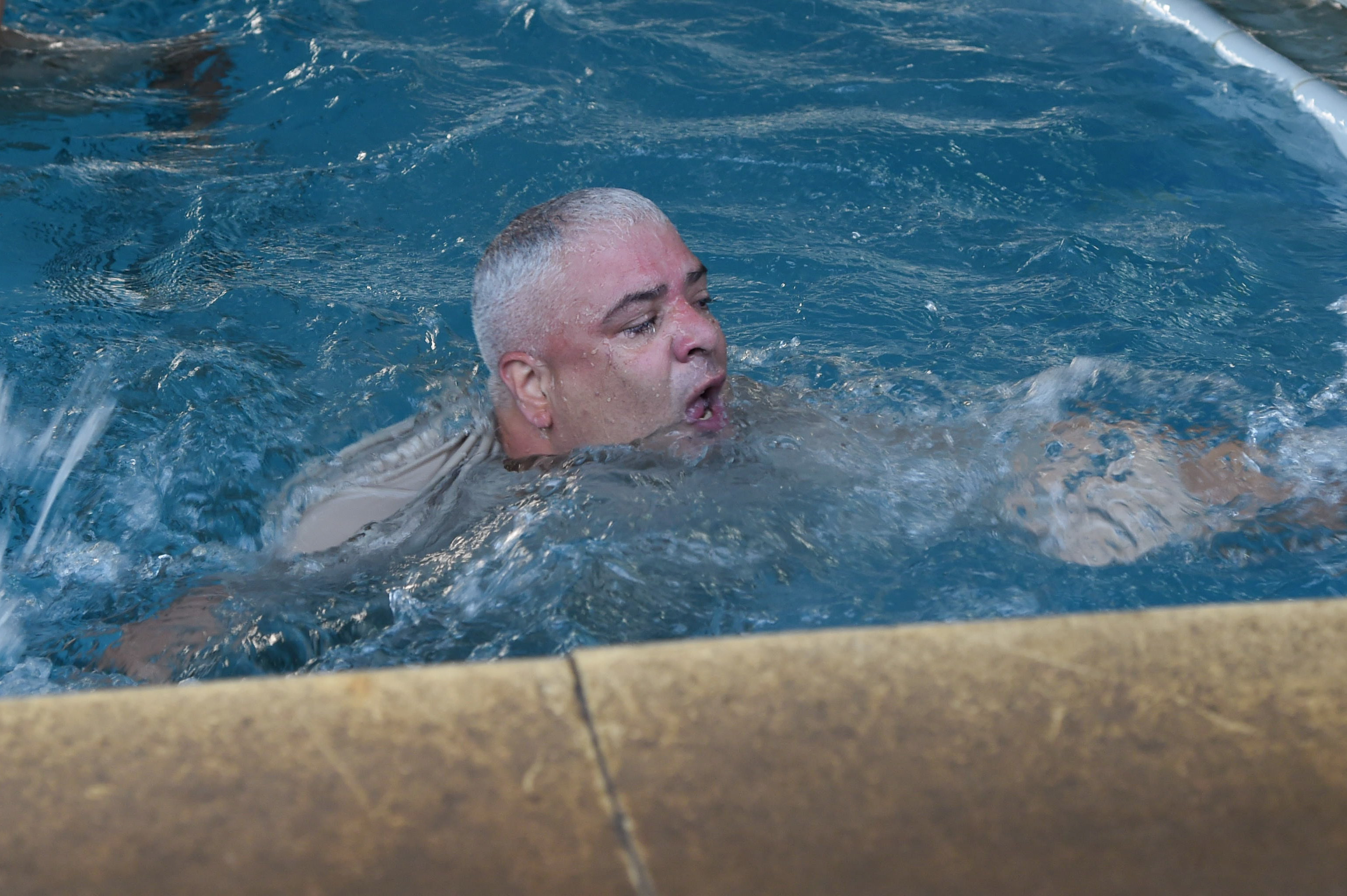 U.S. Army Staff Sgt. Martin Sierra, Combined Joint Task Force-Horn of Africa Civil Affairs, and his team compete in the swim portion of a mud run hosted by the French military, Nov. 6, 2016, in Djibouti, Djibouti. The event allowed coalition forces from French, Japanese, and American teams to interact and build camaraderie while navigating a five kilometer course. The French 5th Marine Regiment team took first place. (U.S. Air Force photo by Staff Sgt. Penny Snoozy)