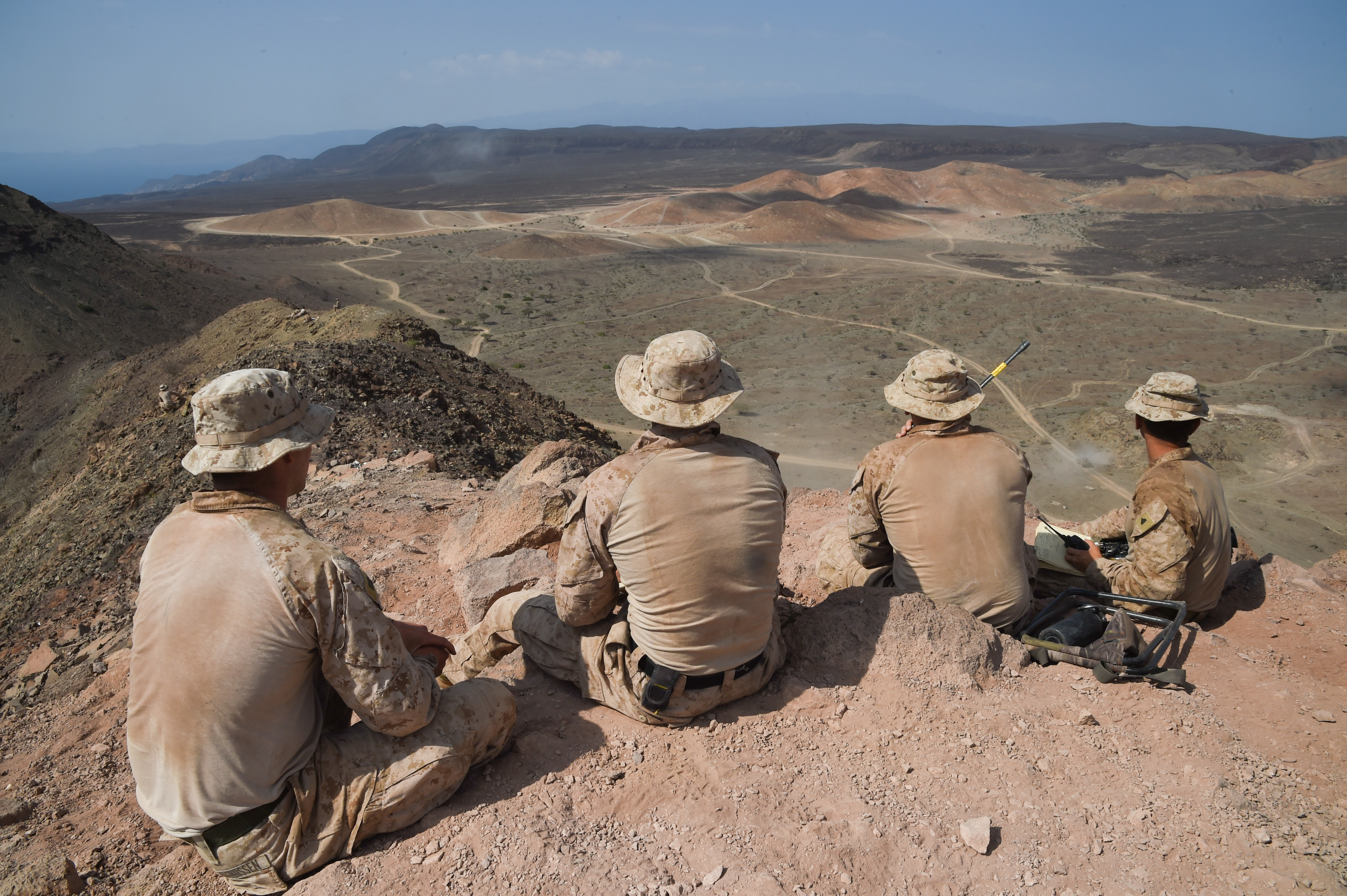 U.S. Marine Corps members with 1st Air Naval Gunfire Liaison Company (ANGLICO), 11th Marine Expeditionary Unit (MEU), wait to communicate with players during a helo-borne raid on the range during Exercise Alligator Dagger, Dec. 18, 2016, at Arta Plage, Djibouti. The exercise allows opportunities for the 11th MEU to maintain their respective skills and proficiencies while intermittently participating in bilateral training with the French. (U.S. Air National Guard photo by Staff Sgt. Penny Snoozy)