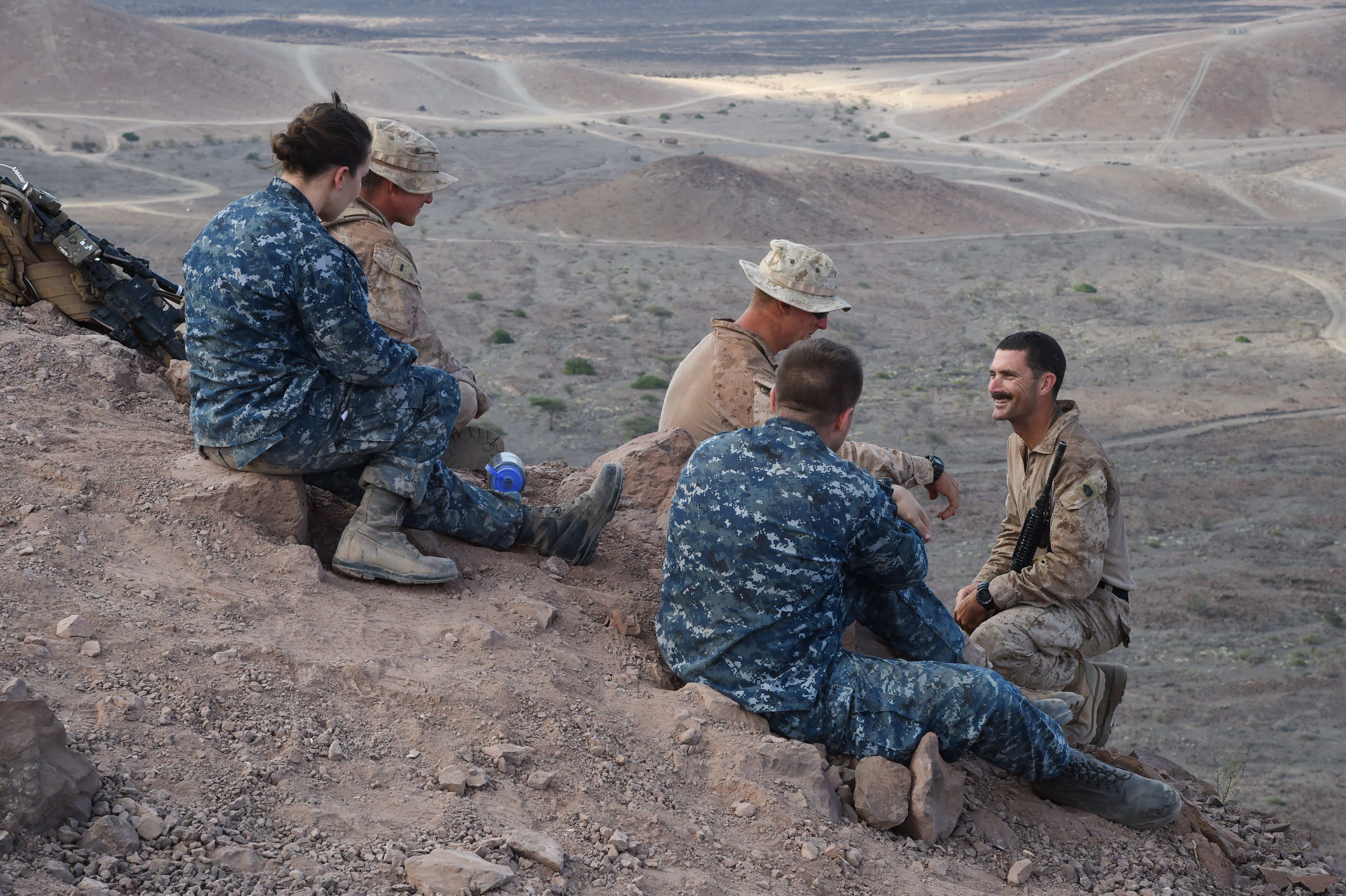 U.S. Marine Corps 2nd Lt. Joshua Gray, Scout Sniper Platoon, Battalion Landing Team 1st Battalion, 4th Marines, 11th Marine Expeditionary Unit (MEU), speaks with the 3rd Infantry French Marines’ Sniper Platoon during exercise Alligator Dagger, Dec. 13, 2016, at Arta Plage, Djibouti. The Marines participated in an unknown distance course as a part of bilateral training with the French. The exercise allows opportunities for the 11th MEU to maintain their respective skills and proficiencies. (U.S. Air National Guard photo by Staff Sgt. Penny Snoozy)