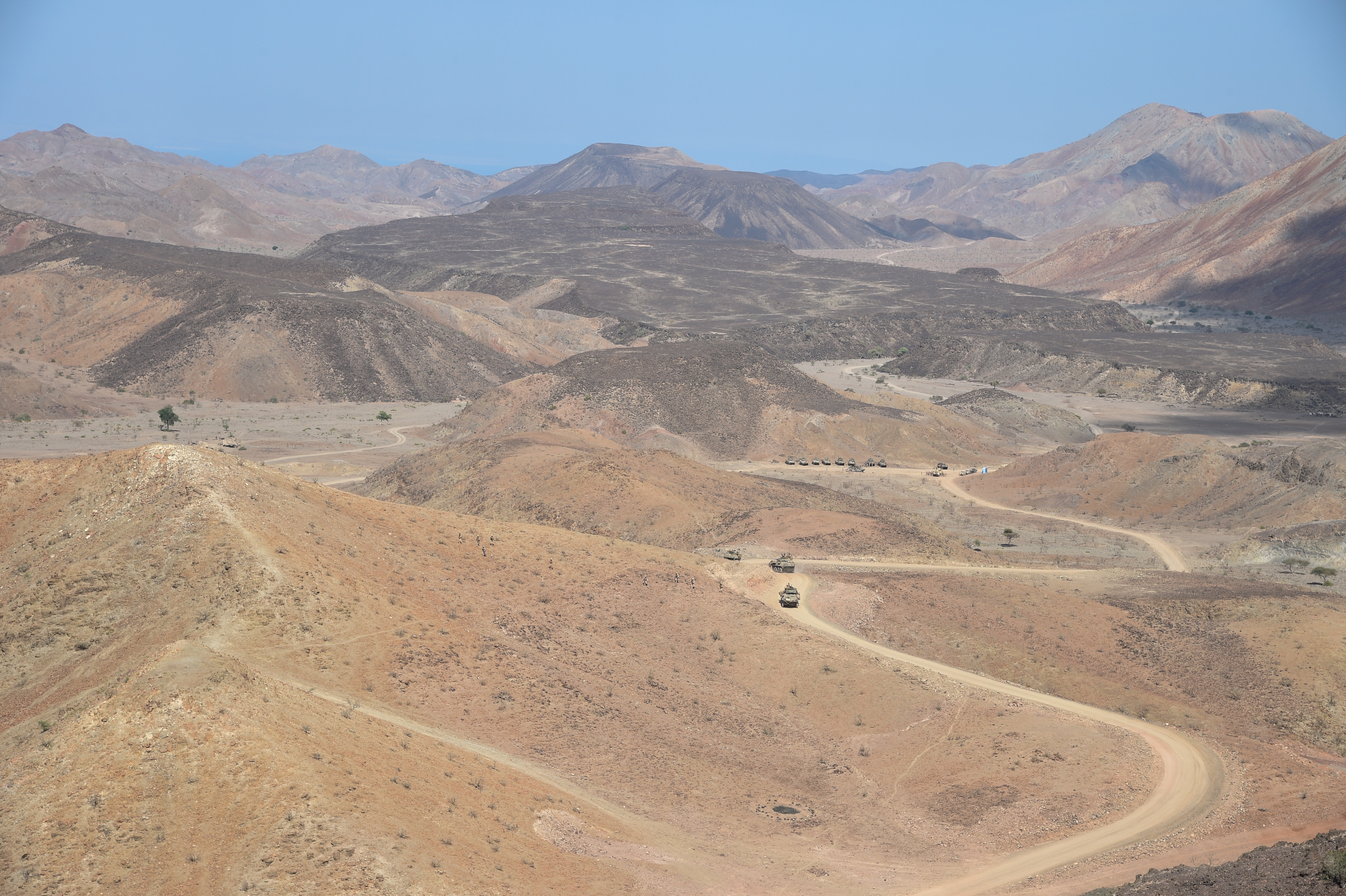 U.S. Marine Corps members with the 11th Marine Expeditionary Unit (MEU), hike a hillside while light armored vehicles traverse the range during events of exercise Alligator Dagger, Dec. 18, 2016, at Arta Plage, Djibouti. The exercise allows the MEU to get off ship and conduct combat sustainment training to maintain their respective skills and proficiencies. (U.S. Air National Guard photo by Staff Sgt. Penny Snoozy)