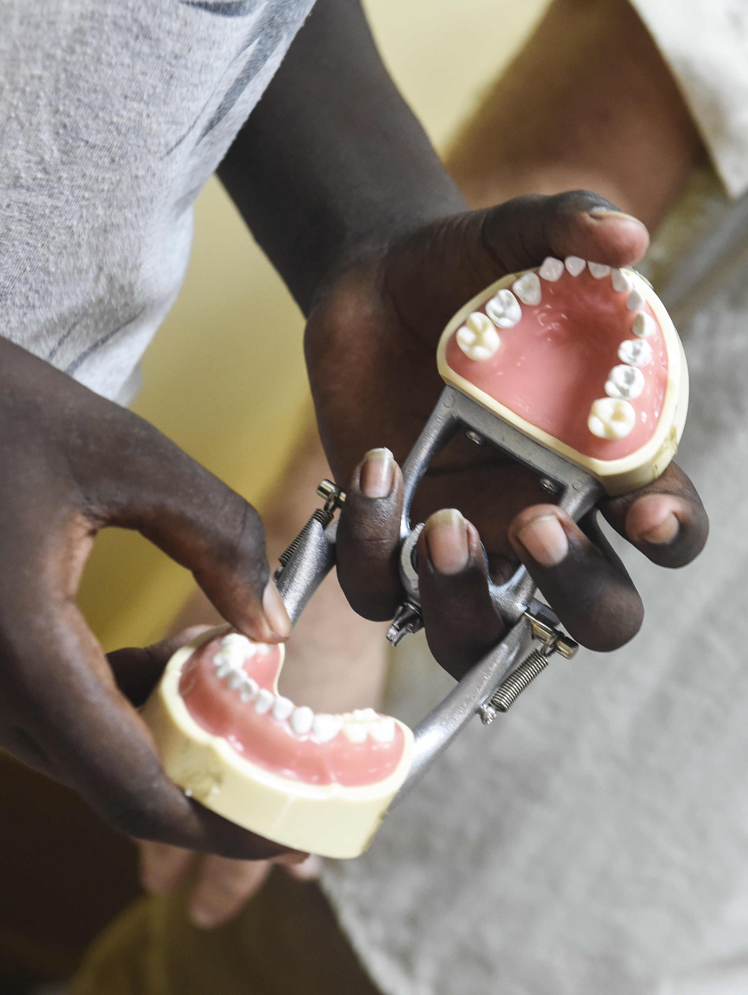 A child uses a dental typodont to count the number of teeth in an average 7-year-old mouth during an oral hygiene demonstration at Caritas Djibouti, a humanitarian organization in Djibouti City, Djibouti, Aug. 8, 2017. In support of the Combined Joint Task Force-Horn of Africa’s efforts to promote regional security and stability, the 443rd Civil Affairs Battalion functional specialty team conducted multiple oral hygiene instruction classes for approximately 60 children from the local area. (U.S. Air Force photo by Staff Sgt. Eboni Prince)