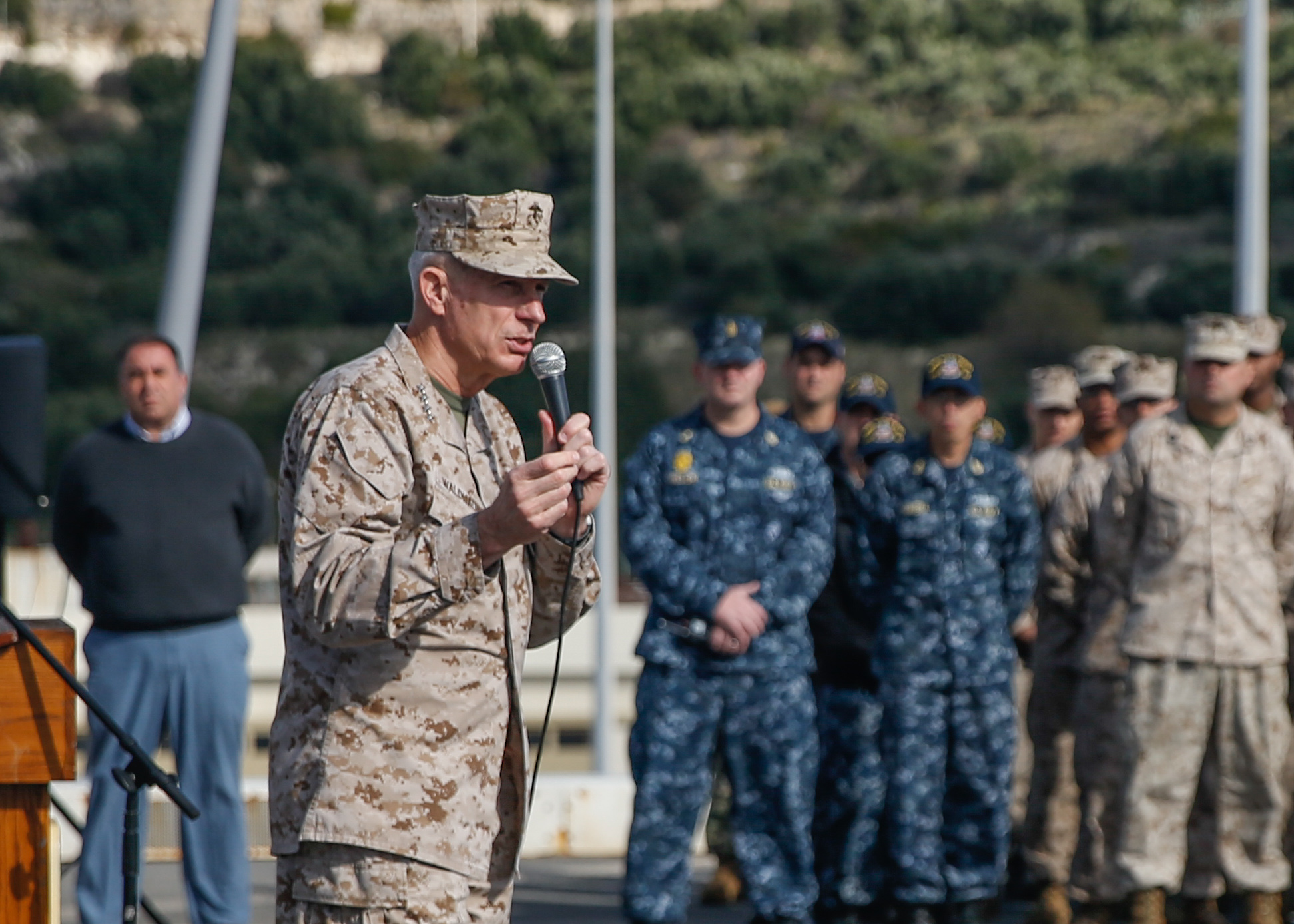 Waldhauser arrived to the ship while it was moored in Souda Bay, Greece for a port visit. Accompanying him was the Deputy to the Commander for Civil-Military Engagement Amb. Alex Laskaris, and the Deputy Director for Plans and Strategic Integration, U.S. Army Brig. Gen. Tim McAteer.