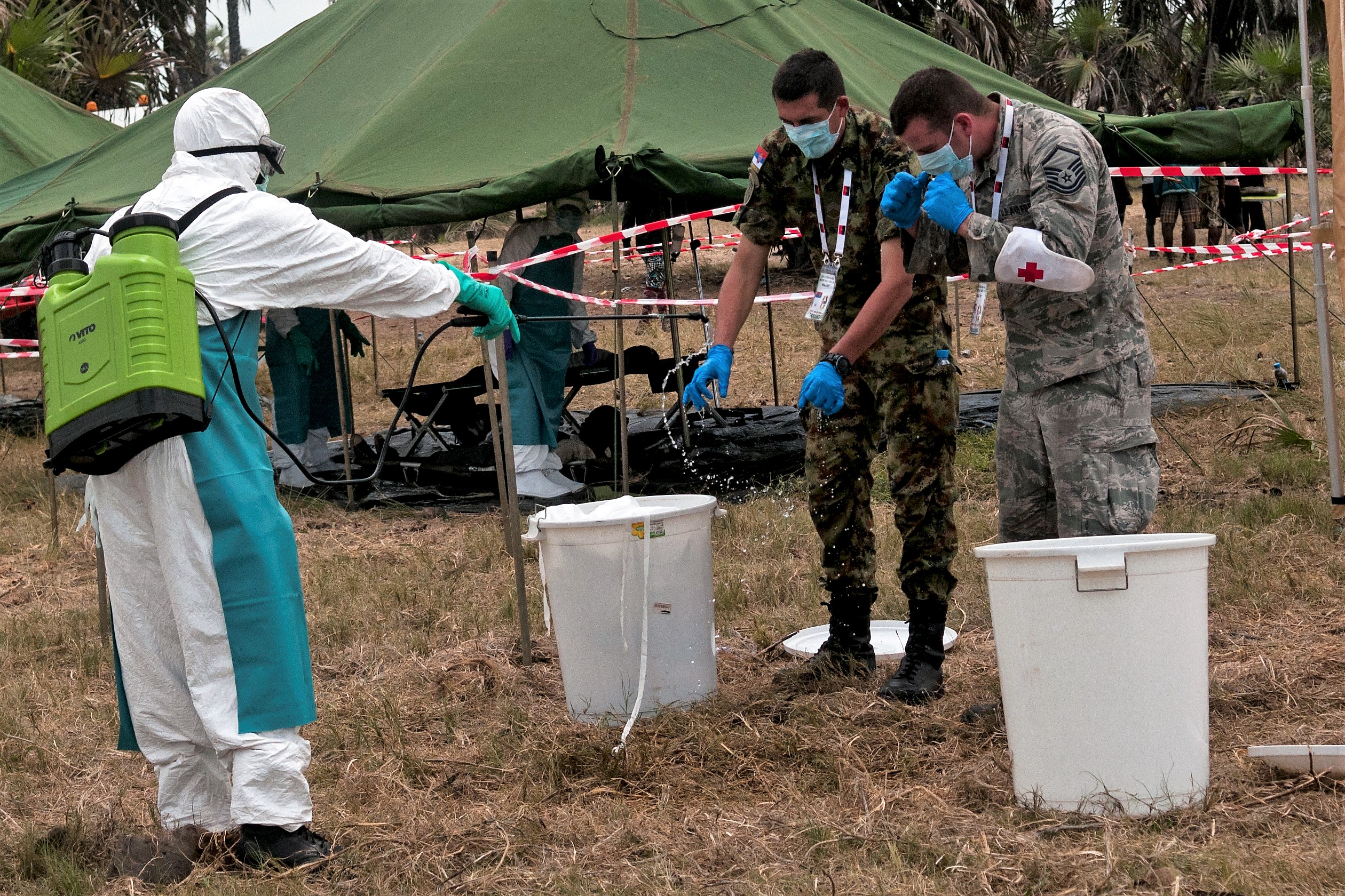 Master Sgt. Christopher Ice (right) of the Ohio Air National Guard and a member of the Serbian Armed Forces (center) take part in a demonstration of a simulated epidemic infectious disease outbreak during the VIP day and closing ceremony for PAMBALA 2017, Dec. 14, 2017, in Bengo Province, Angola. Highlights of the event included a demonstration of an infectious disease crisis response by the Angolan police and firefighting units, the Angolan Armed Forces and some of the Serbian and Ohio National Guard personnel. (Ohio National Guard photo by Staff Sgt. Wendy Kuhn)