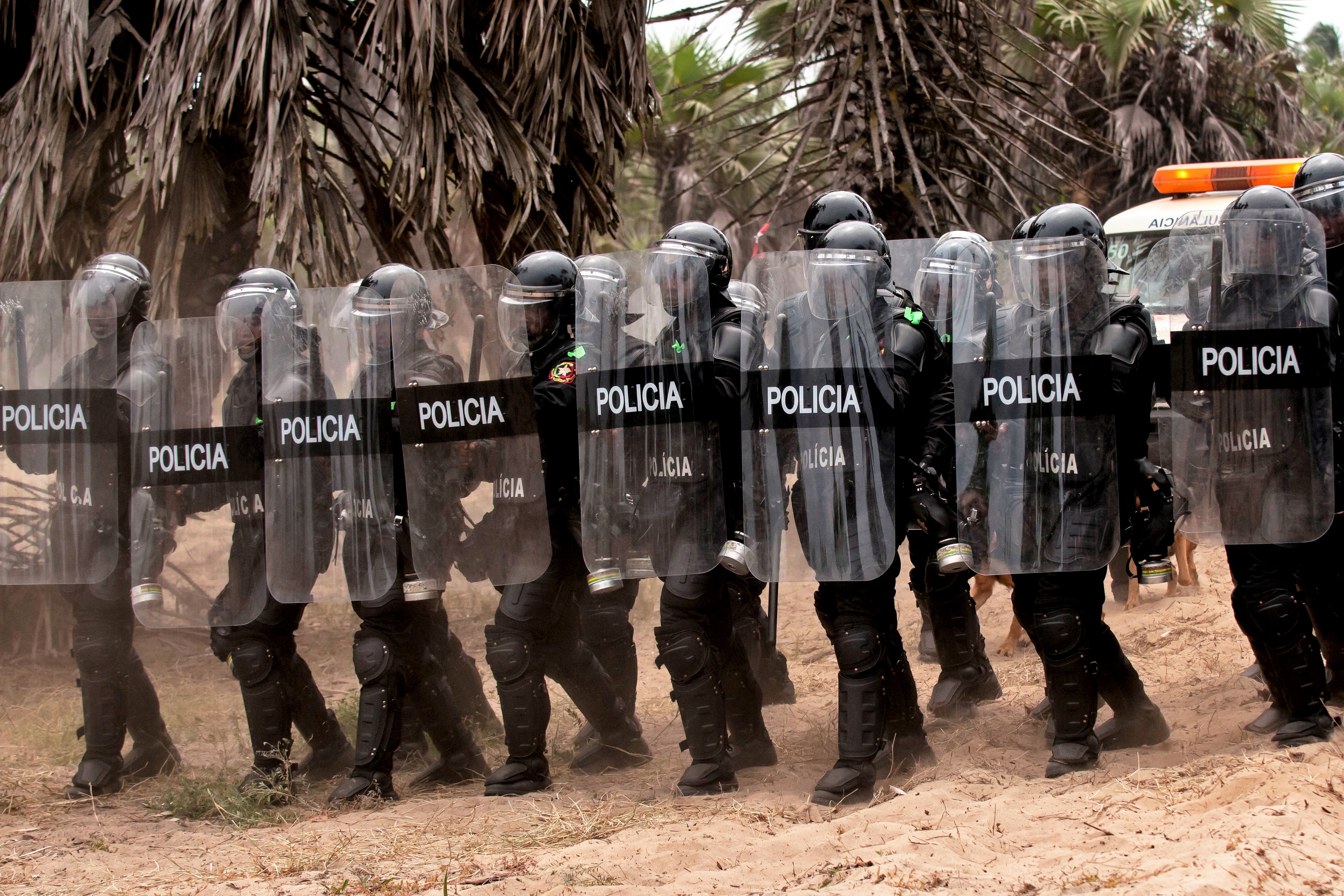 Members of the Angolan police forces demonstrate a response to a riot situation during a simulated epidemic infectious disease outbreak during the VIP day and closing ceremony for PAMBALA 2017, Dec. 14, 2017, in Bengo Province, Angola. Highlights of the event included a demonstration of an infectious disease crisis response by the Angolan police and firefighting units, the Angolan Armed Forces and some of the Serbian and Ohio National Guard personnel. (Ohio National Guard photo by Staff Sgt. Wendy Kuhn)