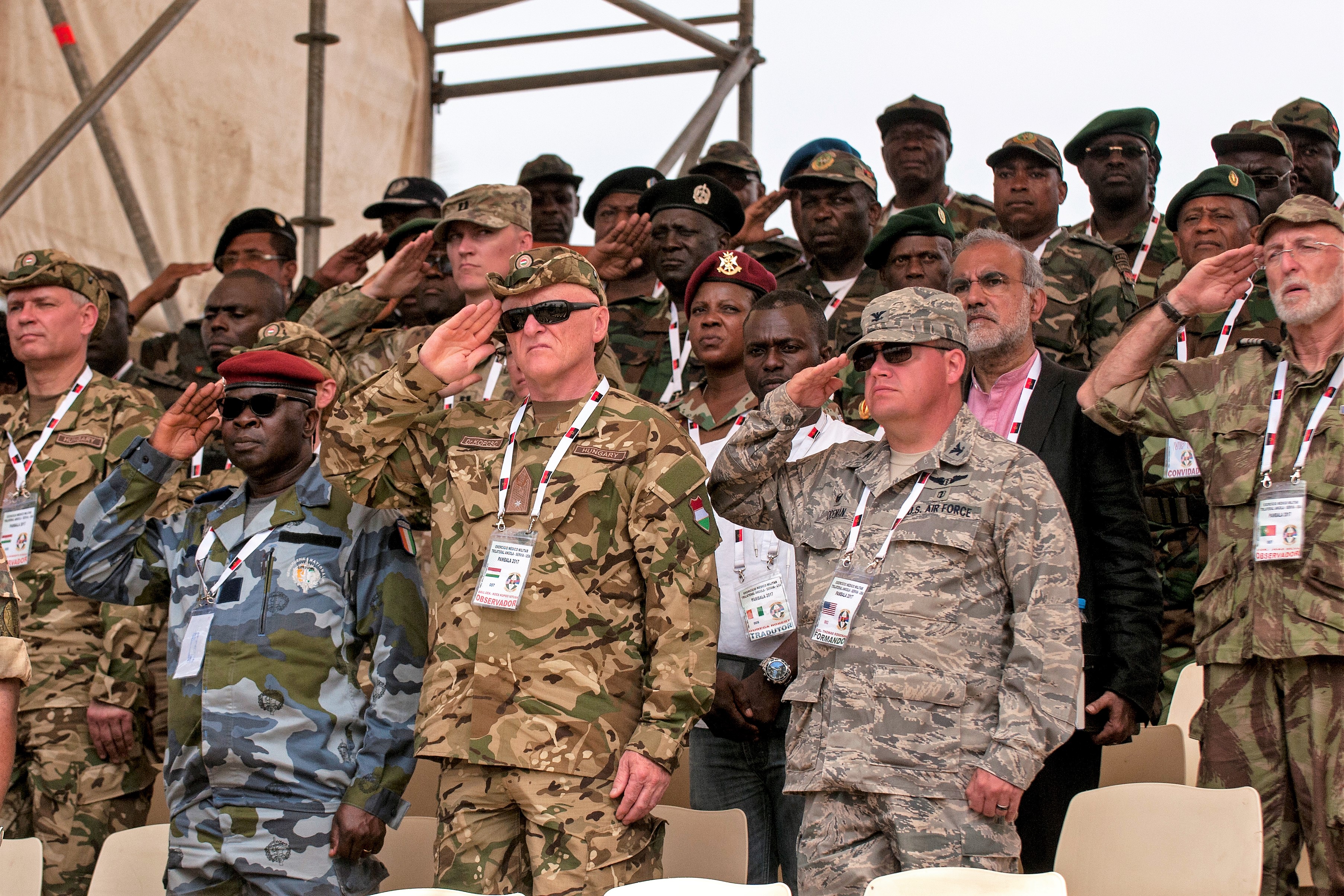 Representatives of several countries from all over the world, including the Ivory Coast, Portugal and Hungary, attend the closing ceremony and VIP day for the PAMBALA 2017 exercise Dec. 14, 2017, Bengo Province, Angola. During the closing ceremony, members of both the Serbian Armed Forces and the Ohio National Guard exchanged flags with their host nation, Angola, and remarks were given by representatives of each participating country on the success of the first-ever trilateral engagement. (Ohio National Guard photo by Staff Sgt. Wendy Kuhn)