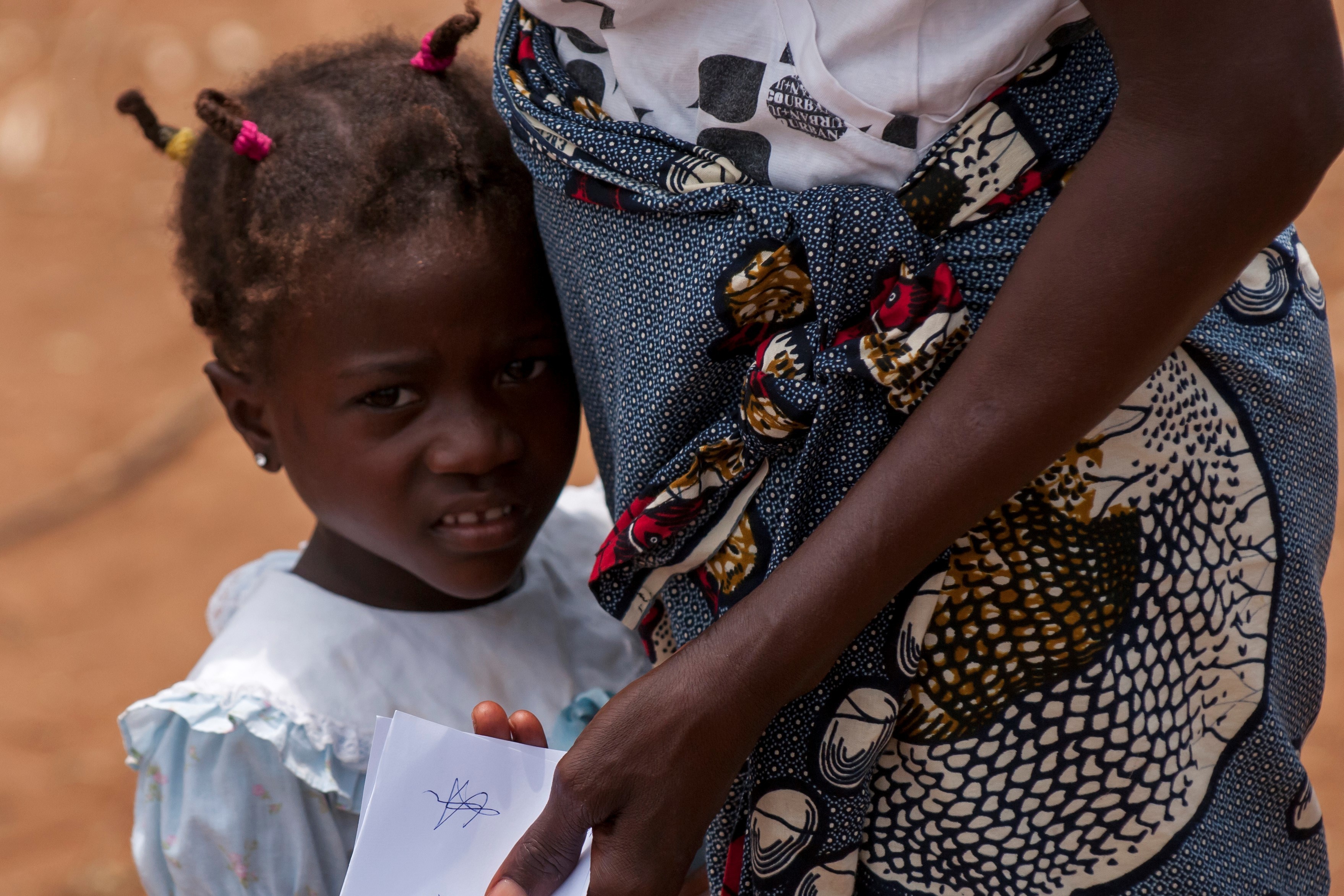 A child waits with her family outside one of the field hospital clinics in the village of Ceramica during the PAMBALA 2017 exercise Dec. 13, 2017, in Bengo Province, Angola. By participating in this trilateral medical engagement alongside the Angolan and Serbian Armed Forces, the Ohio National Guard is gaining real-world experience and training on tropical diseases while also providing valuable coaching and mentorship on disease management and containment. (Ohio National Guard photo by Staff Sgt. Wendy Kuhn)