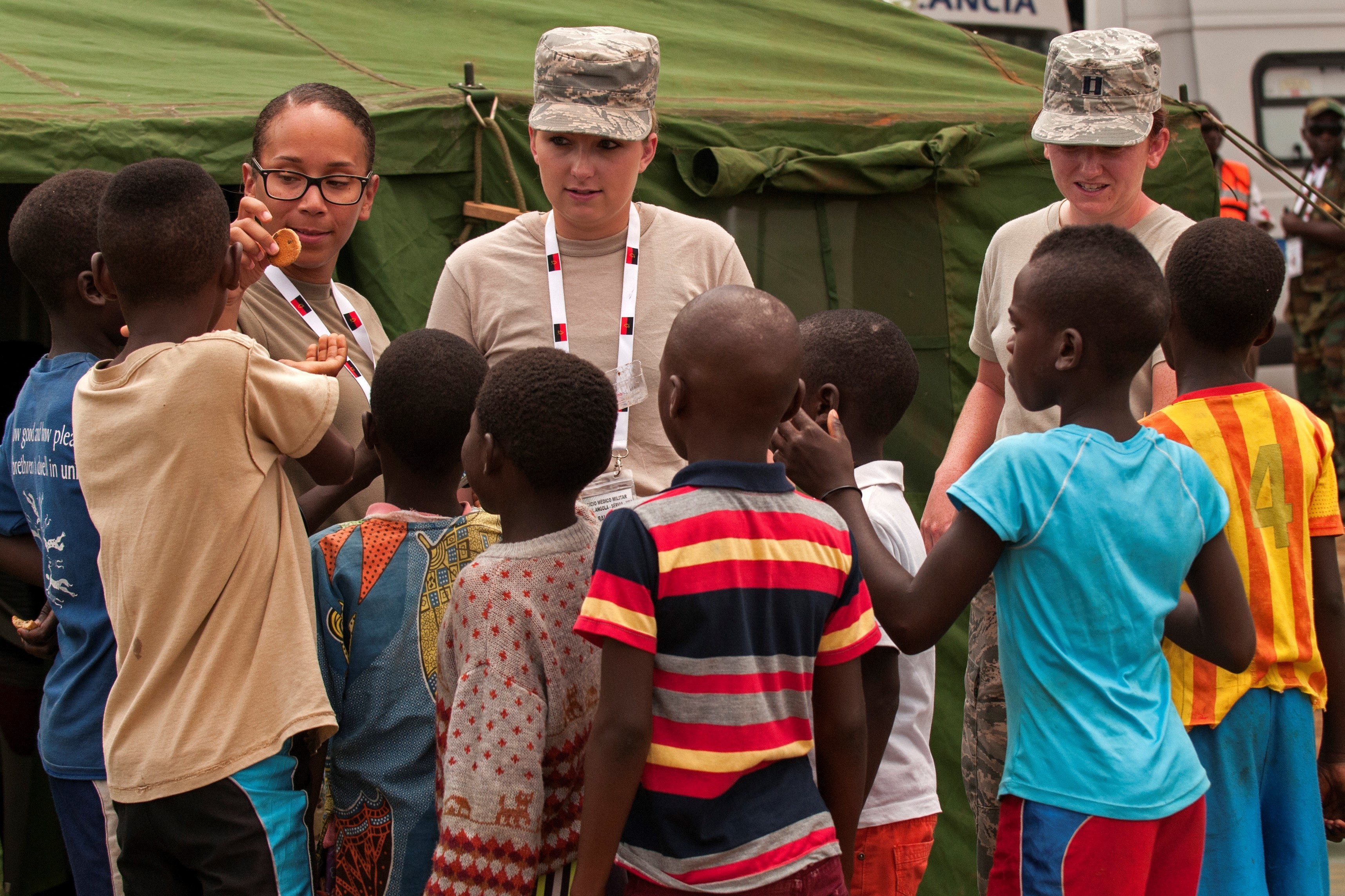 Staff Sgt. Ashley Maldonado (from left), Senior Airman Hannah Halcomb and Capt. Sarah Woodson from the Ohio National Guard pass out snacks to children in the village of Ceramica during the PAMBALA 2017 exercise Dec. 13, 2017, in Bengo Province, Angola. By participating in this trilateral medical engagement alongside the Angolan and Serbian Armed Forces, the Ohio National Guard is gaining real-world experience and training on tropical diseases while also providing valuable coaching and mentorship on disease management and containment. Ohio has been paired with the Republic of Serbia since 2006 through the National Guard State Partnership Program. (Ohio National Guard photo by Staff Sgt. Wendy Kuhn)