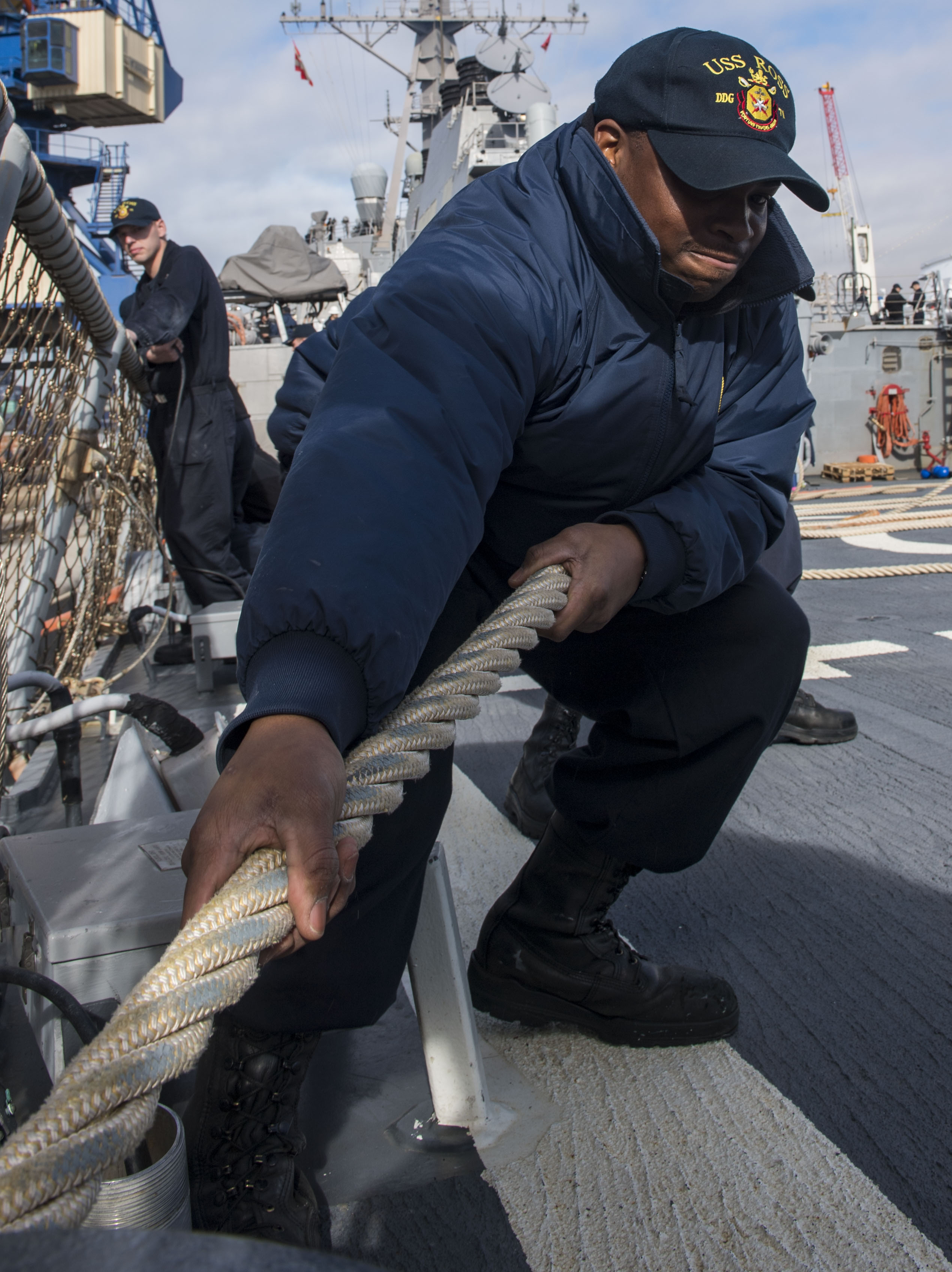 AGADIR, Morocco (Jan. 10, 2018) Fire Controlman (Aegis) 3rd Class Mark Bowman heaves a mooring line as the Arleigh Burke-class guided-missile destroyer USS Ross (DDG 71) pulls in to Agadir, Morocco, Jan. 10, 2018. Ross, forward-deployed to Rota, Spain, is on its sixth patrol in the U.S. 6th Fleet area of operations in support of regional allies and partners and U.S. national security interests in Europe and Africa. (U.S. Navy photo by Mass Communication Specialist 1st Class Kyle Steckler/Released)