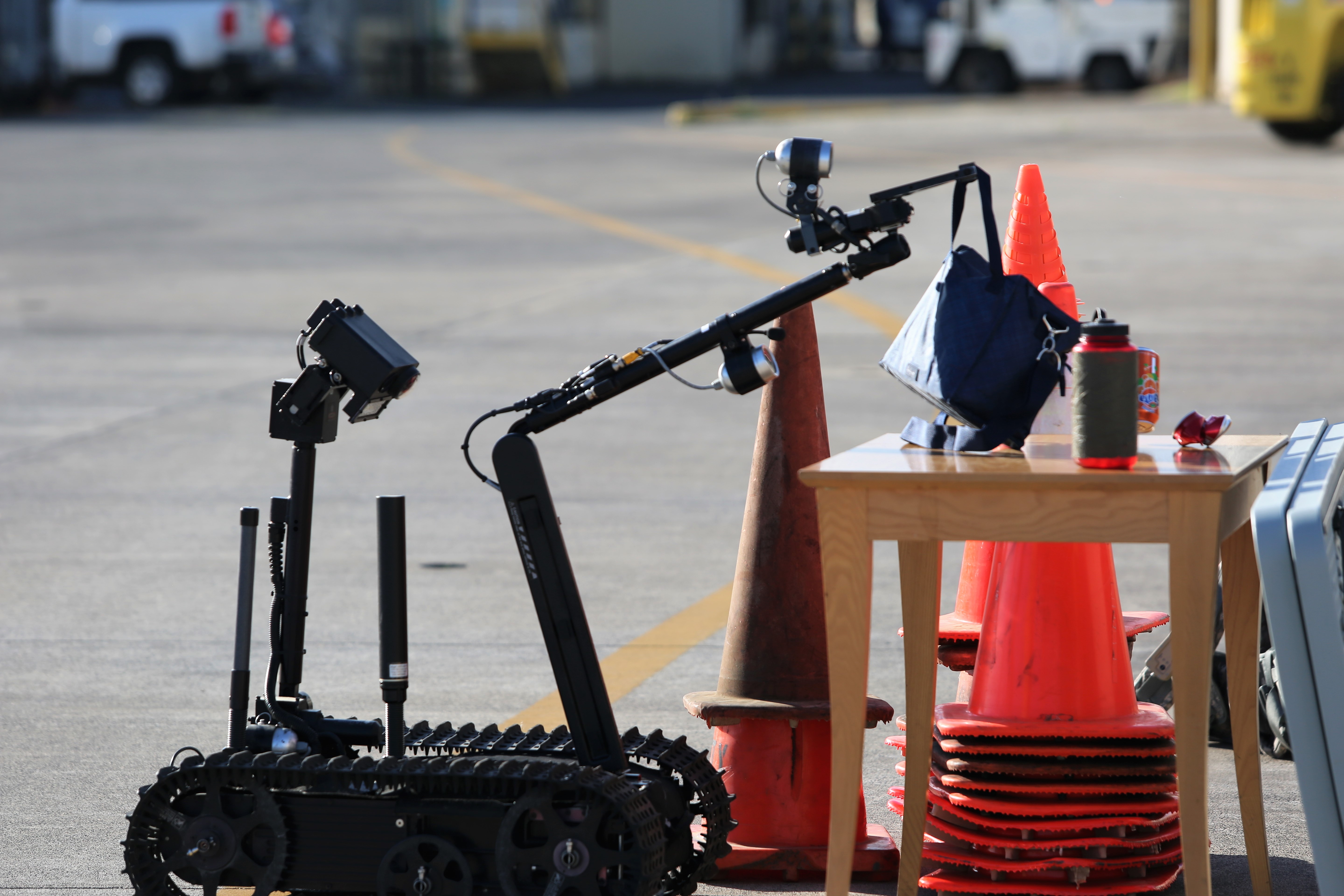 A bomb disposal robot inspects a suspicious object during non-combatant evacuation operation training aboard Naval Air Station Sigonella, Italy, on Nov. 17, 2017. SPMAGTF-CR-AF deployed to conduct limited crisis-response and theater-security operation in Europe and Africa. (U.S. Marine Corps photo by Lance Cpl. Patrick Osino/Released)