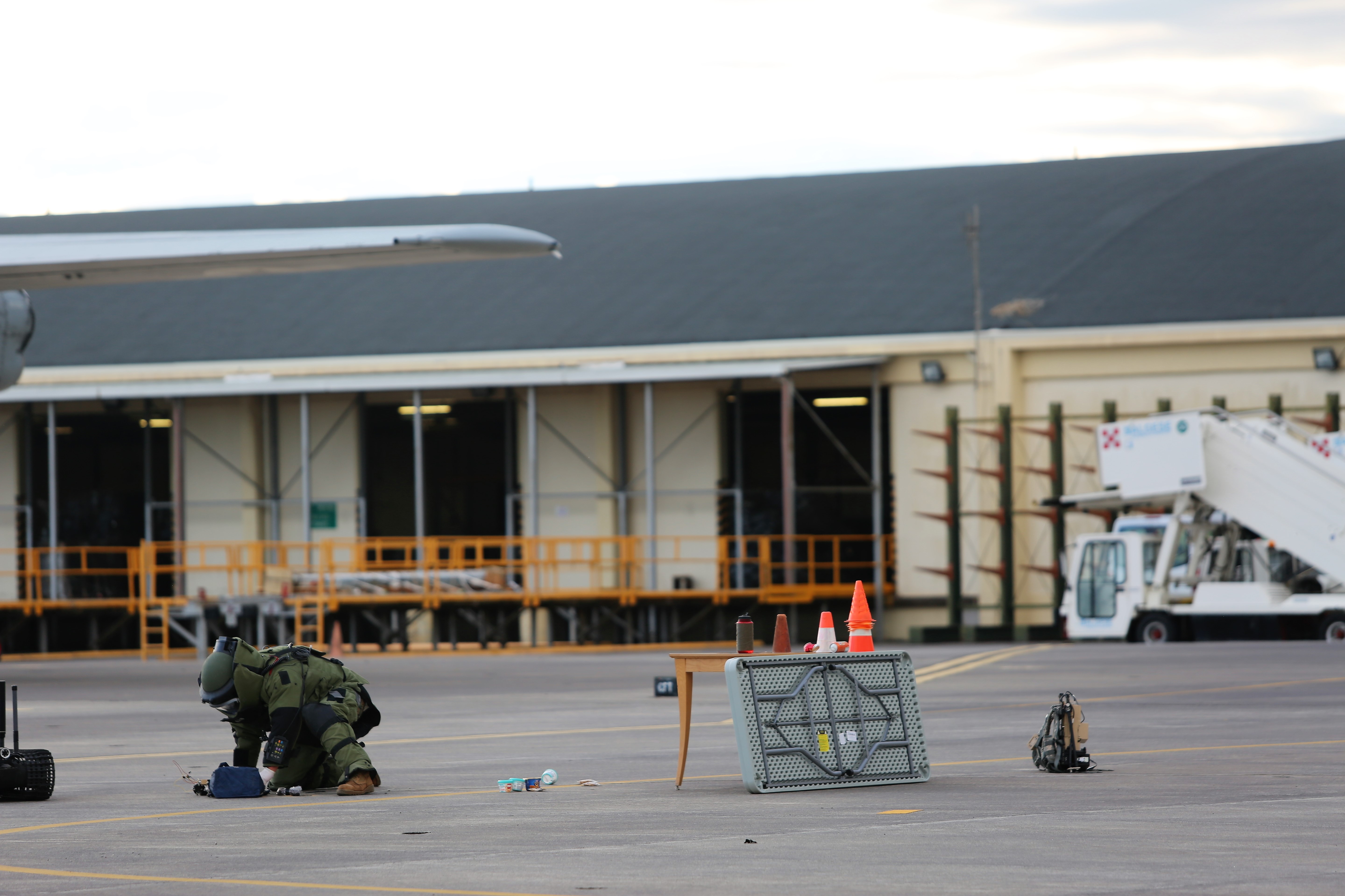 An Explosive Ordnance Disposal technician assigned to Special Purpose Marine Air-Ground Task Force-Crisis Response-Africa inspect suspicious luggage during non-combatant evacuation operation training aboard Naval Air Station Sigonella, Italy, on Nov. 17, 2017. SPMAGTF-CR-AF deployed to conduct limited crisis-response and theater-security operation in Europe and Africa. (U.S. Marine Corps photo by Lance Cpl. Patrick Osino/Released)