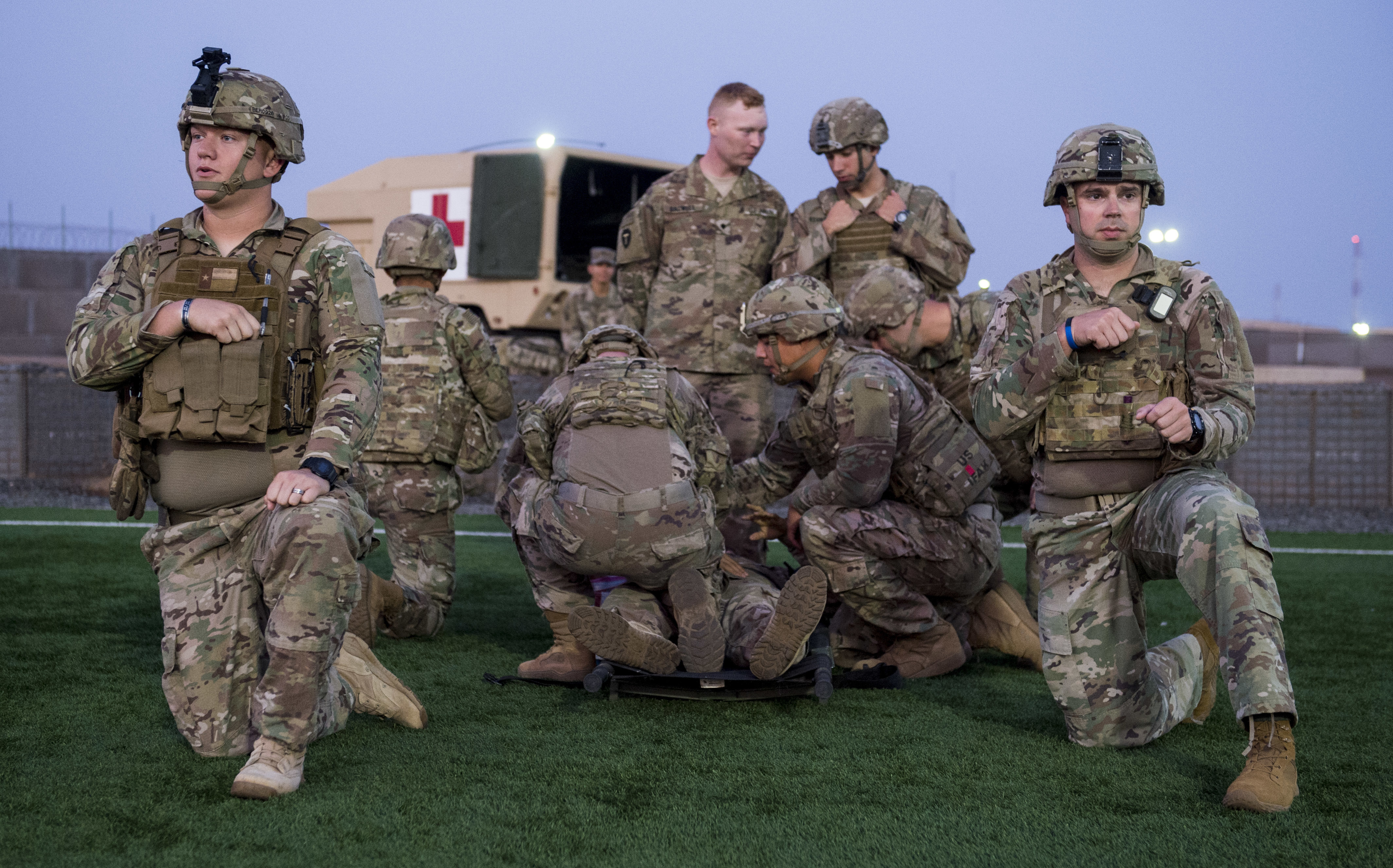 U.S. Army Soldiers assigned to Task Force Bayonet, Combined Joint Task Force - Horn of Africa, reassess a fellow Soldier’s condition after treating a simulated open chest wound and moving the patient during a Combat Lifesaver (CLS) training event at Camp Lemonnier, Djibouti, Dec. 30, 2017. Participants demonstrated CLS principals during scenarios that simulated being under enemy fire, having the possibility to come under enemy fire, and moving casualties to medical facilities. (U.S. Air Force photo by Staff Sgt. Timothy Moore)