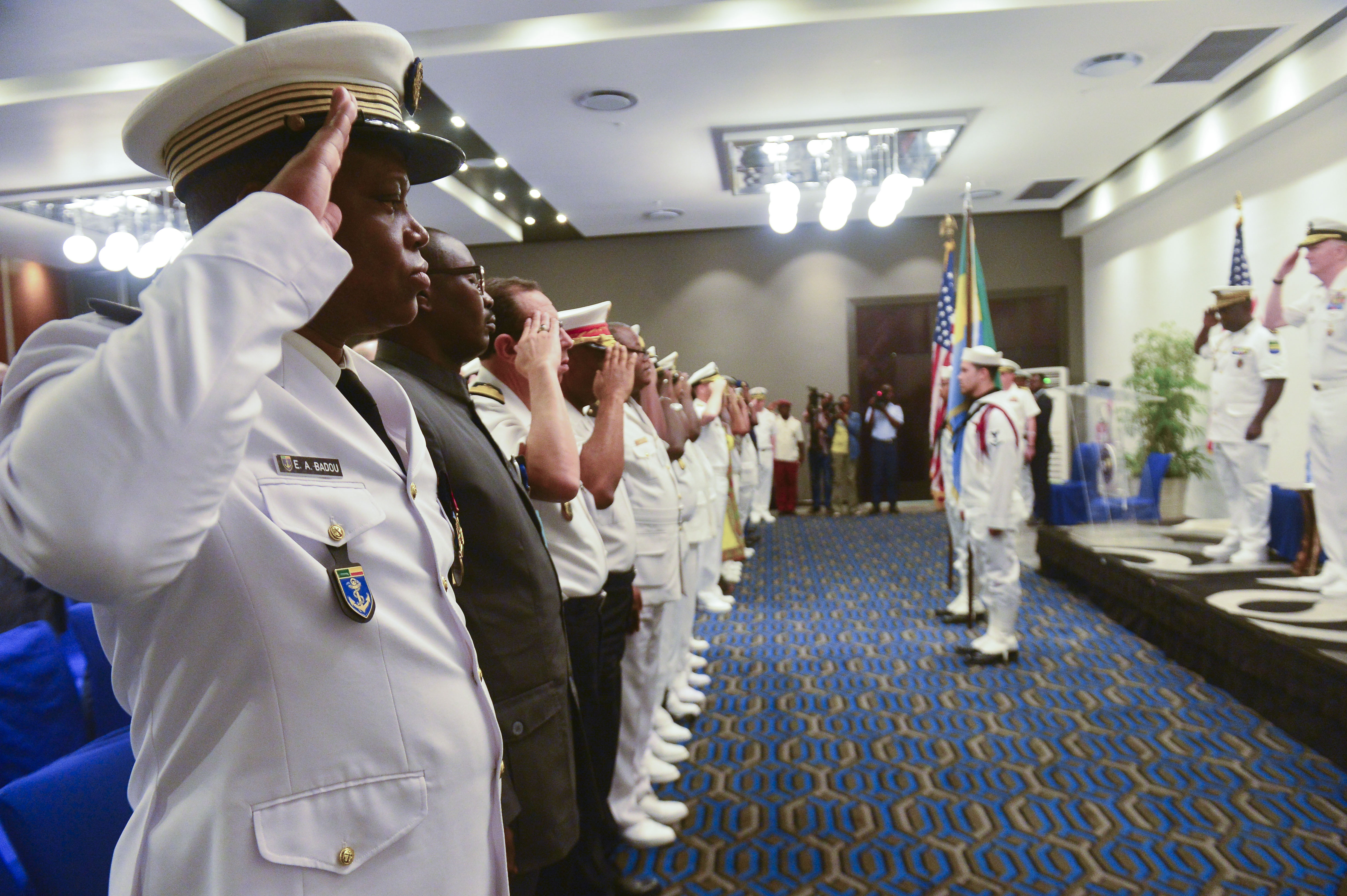 Nearly 100 people attended the closing ceremony in Libreville, Gabon, while the Mount Whitney anchored off the coast several miles from shore. In attendance were senior Naval officers from the 31 participating nations in OE 18 and senior personnel from the U.S. Embassy in Gabon.
