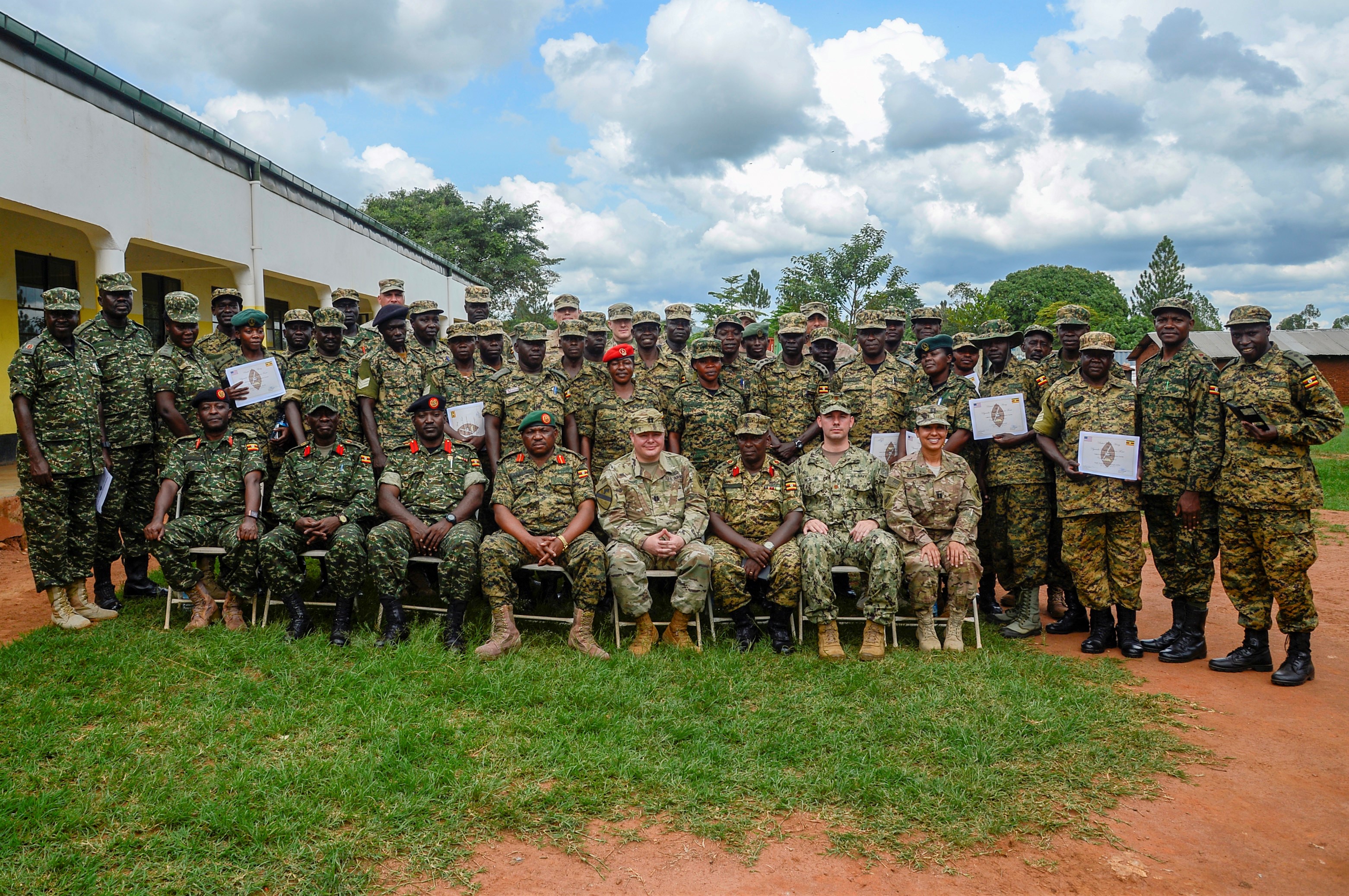 Uganda People’s Defense Force (UPDF) Soldiers and U.S. Army Soldiers from the 404th Civil Affairs Battalion, attached to the Combined Joint Task Force - Horn of Africa, pose for a group photo after a graduation ceremony from a 10-week civil affairs operations course provided by members of the 404th at Camp Singo, Uganda, April 13, 2018. The civil affairs course is designed to enhance the UPDF's capability and capacity to support its enduring African Union peacekeeping force and African Union Mission in Somalia mandates through civil military cooperation. (U.S. Navy Photo by Mass Communication Specialist 2nd Class Timothy M. Ahearn)