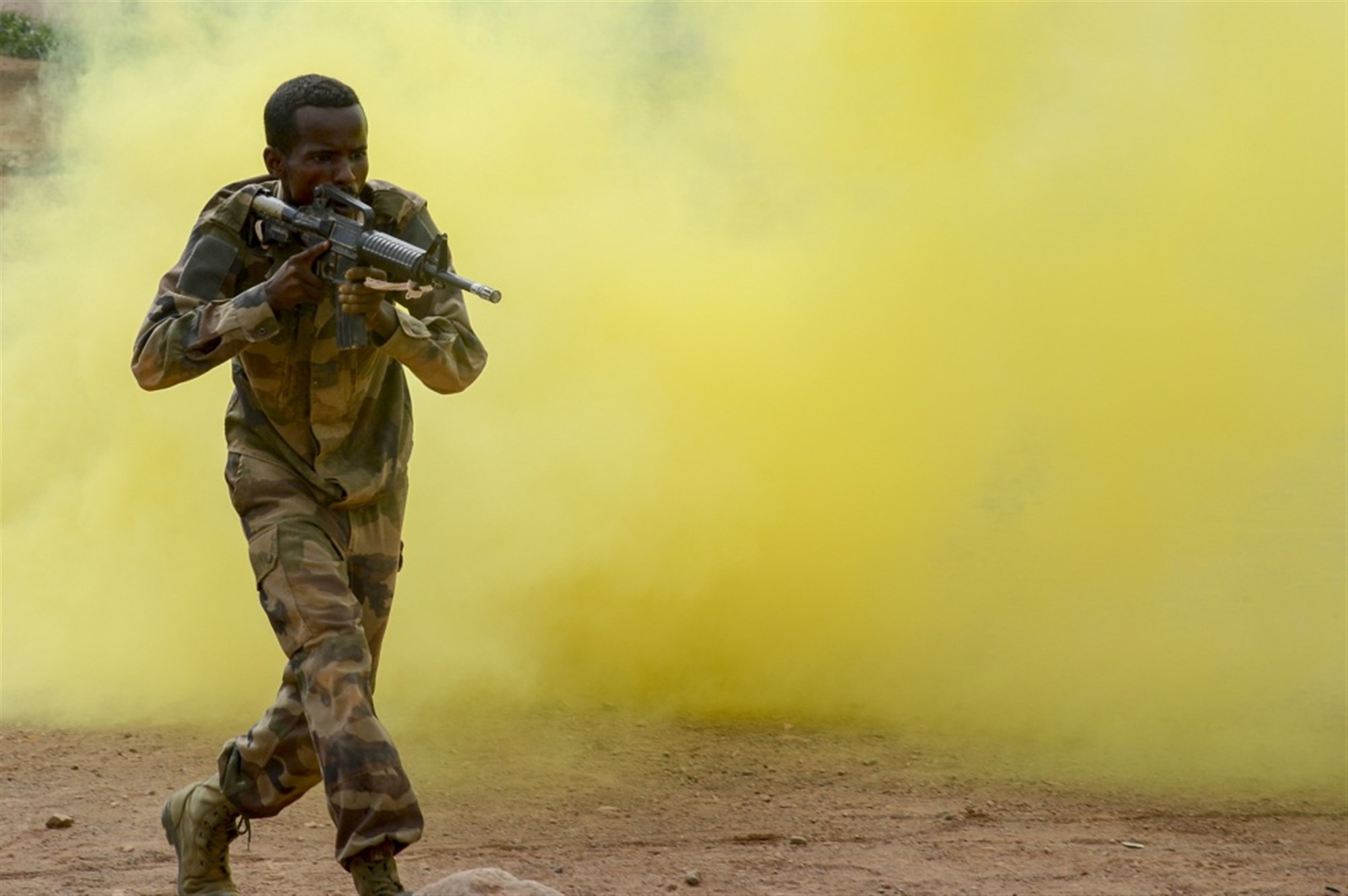 A Djiboutian soldier reacts to simulated contact during the culminating exercise of a five-week training cycle for the newly formed Rapid Intervention Battalion (RIB), a Djiboutian army crisis response unit, at a site outside Djibouti City, May 3, 2018. U.S. Army Soldiers from Alpha Company, 3rd Battalion, 141st Infantry Regiment, Texas National Guard, assigned to Combined Joint Task Force- Horn of Africa conducted the RIB training.