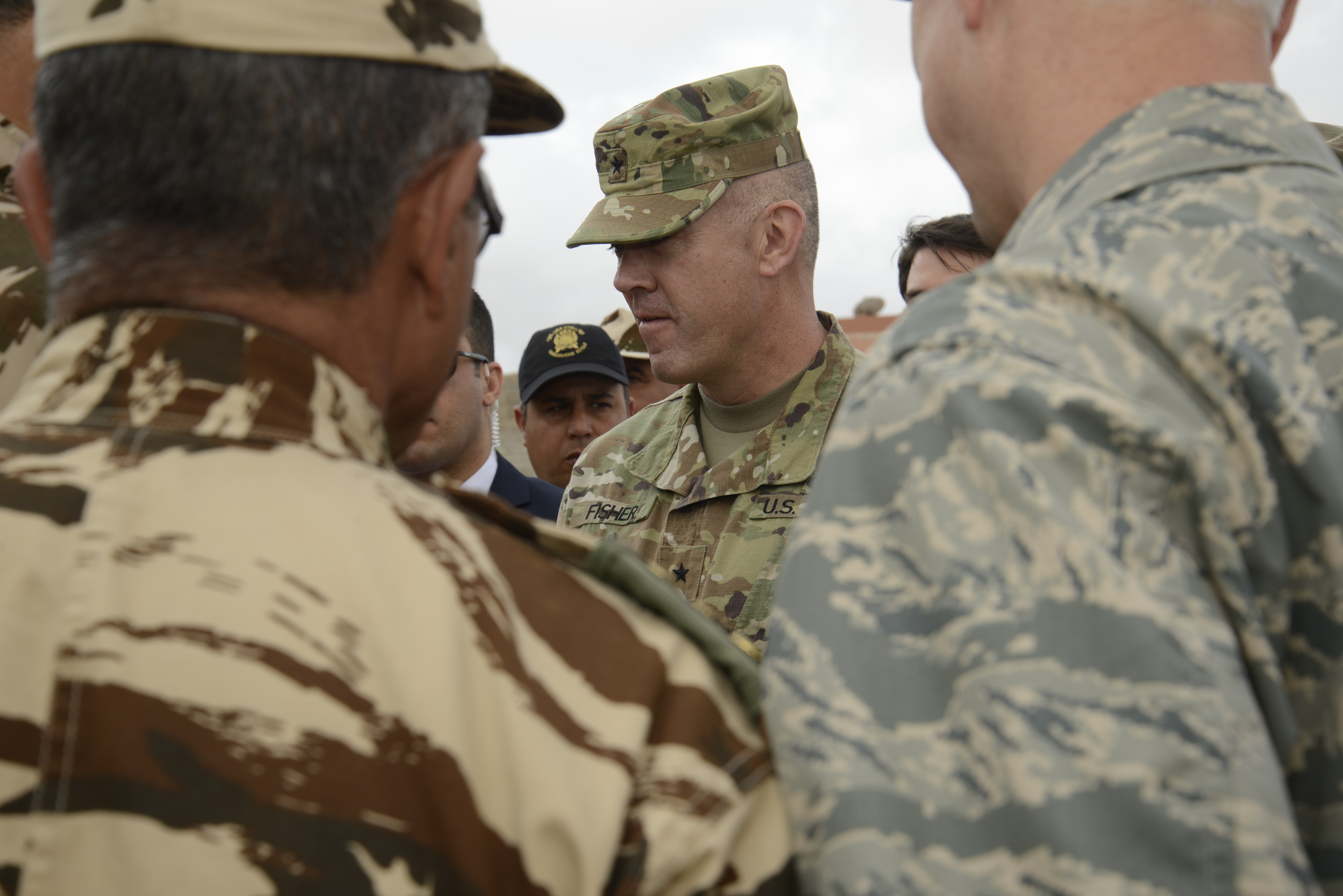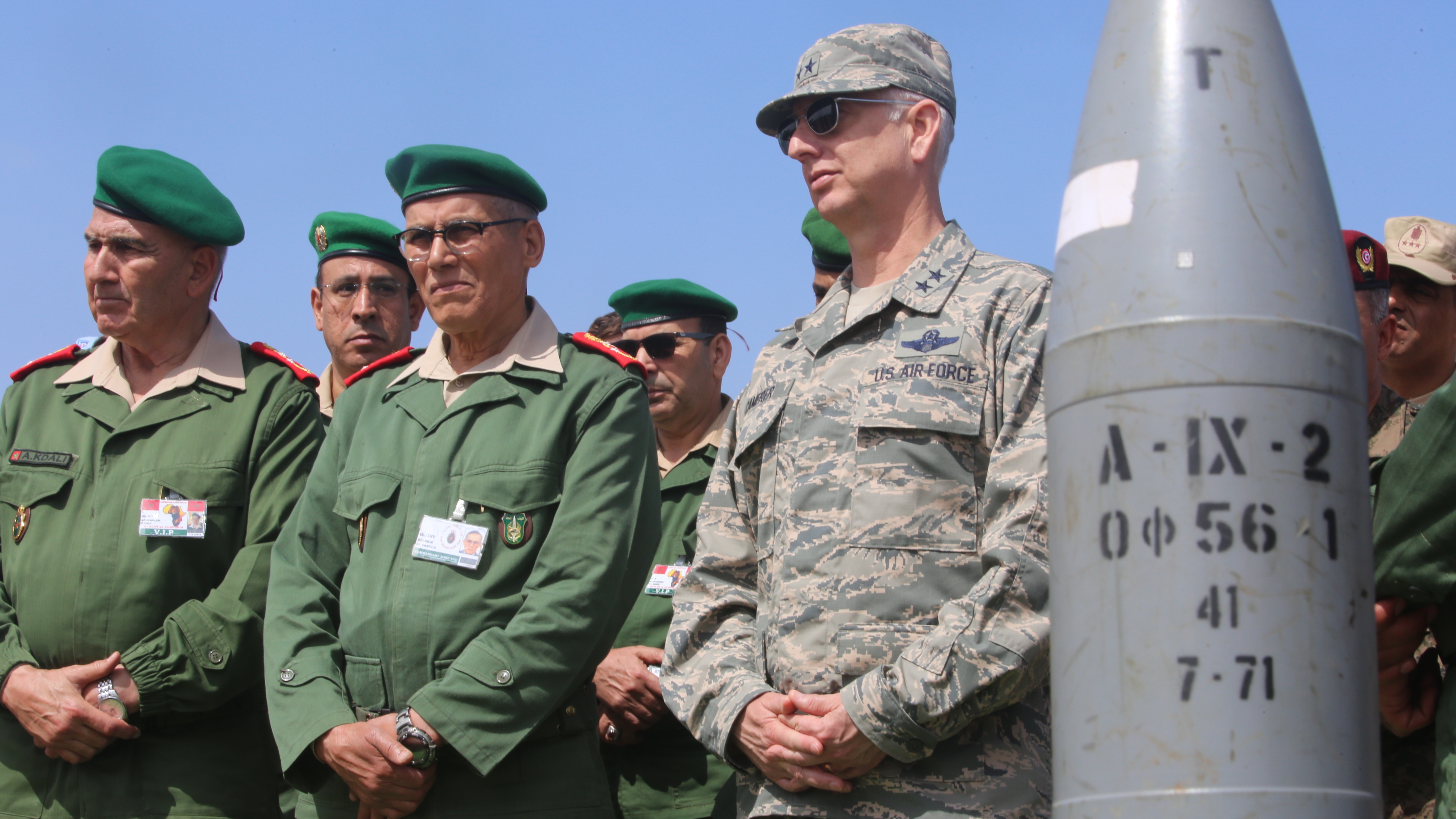 Air Force Maj.Gen. Mark Camerer, director of logistics for U.S. Africa Command, and other distinguished guests of Exercise African Lion 2018 gather during a distinguished visitor tour in Tifnit, Morocco, April 26, 2018. Marines and members of the Moroccan Royal Armed Forces demonstrated tactics, techniques, and procedures from the past two weeks of field training exercises to the distinguished visitors. Exercise African Lion 2018 is a continuation of the U.S. and Morocco’s long-standing relationship focused on security cooperation. (U.S. Marine Corps photo by Sgt. Averi Coppa/Released)