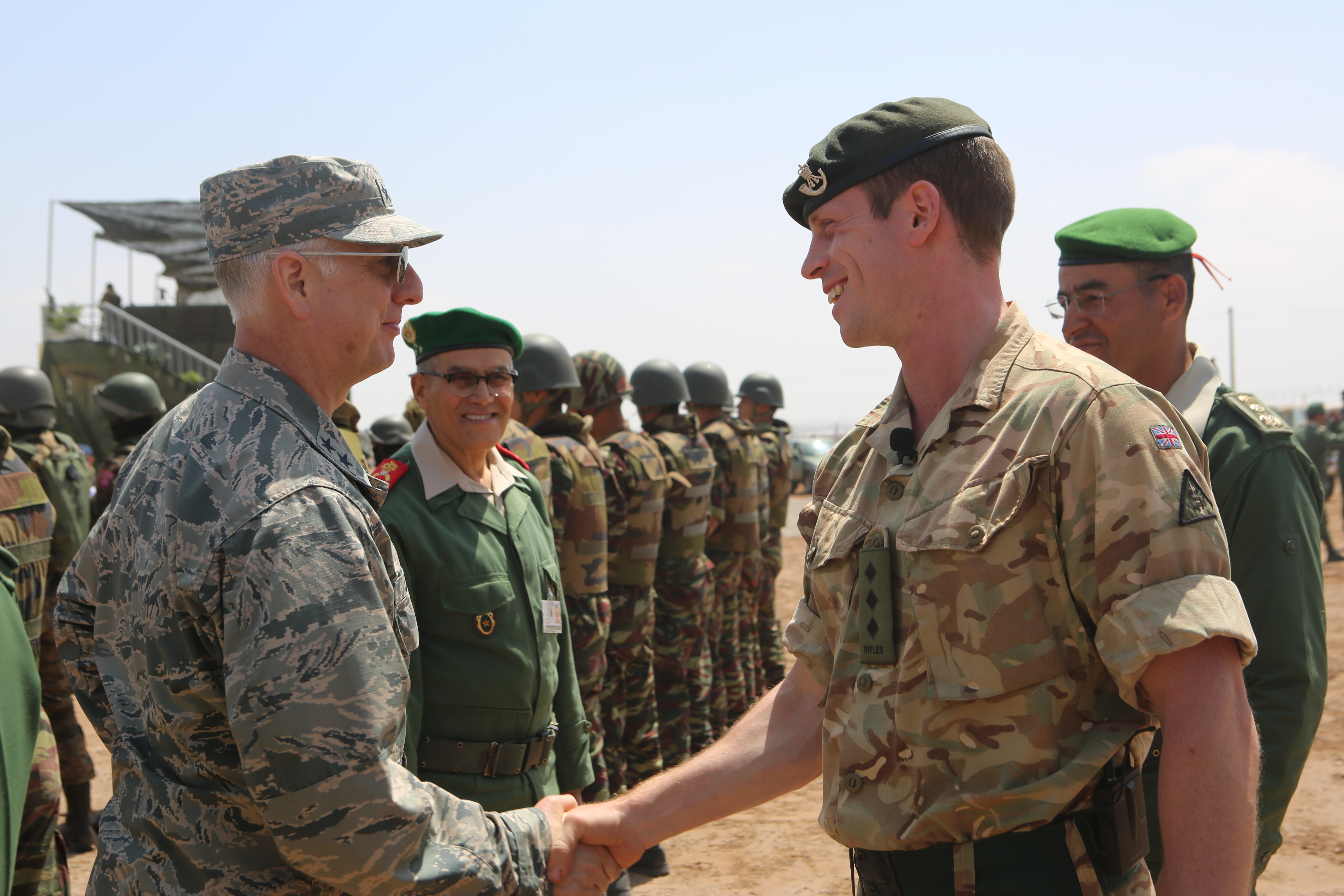 Air Force Maj.Gen. Mark Camerer, director of logistics for U.S. Africa Command, and other distinguished guests shakes hands with British Col. Dom Watson, British 4th Rifles commander, during Exercise African Lion 2018 distinguished visitor tour in Tifnit, Morocco, April 26, 2018. Marines, British soldiers and members of the Moroccan Royal Armed Forces demonstrated tactics, techniques, and procedures from the past two weeks of field training exercises. Exercise African Lion is a continuation of the U.S. and Morocco’s long-standing relationship focused on security cooperation. (U.S. Marine Corps photo by Sgt. Averi Coppa/Released)
