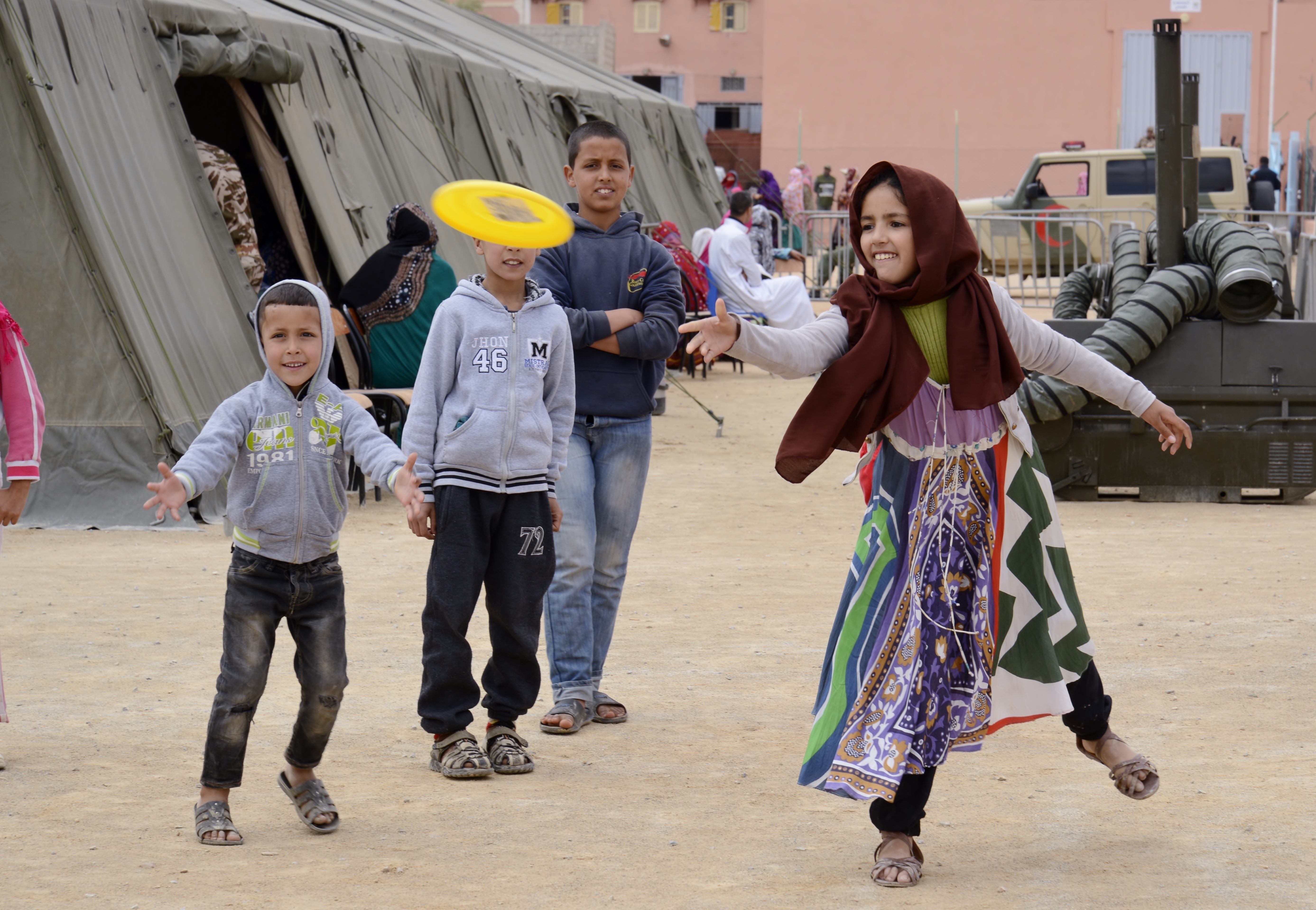 Children playing while waiting for medical services during the Humanitarian Civic Assistance component of Exercise African Lion 2018 in Bounaamane, Morocco, April 25, 2018. Exercise African Lion 2018 is a Chairman of the Joint Chiefs of Staff-sponsored, U.S. African Command-scheduled, U.S. Marine Corps Forces Europe and Africa-led, joint and combined exercise conducted in the Kingdom of Morocco. African Lion offers an opportunity to improve interoperability and cooperation while demonstrating the strong military bond that exists between the participating nations. (U.S. Army National Guard photo by Maj. Samantha Madsen)
