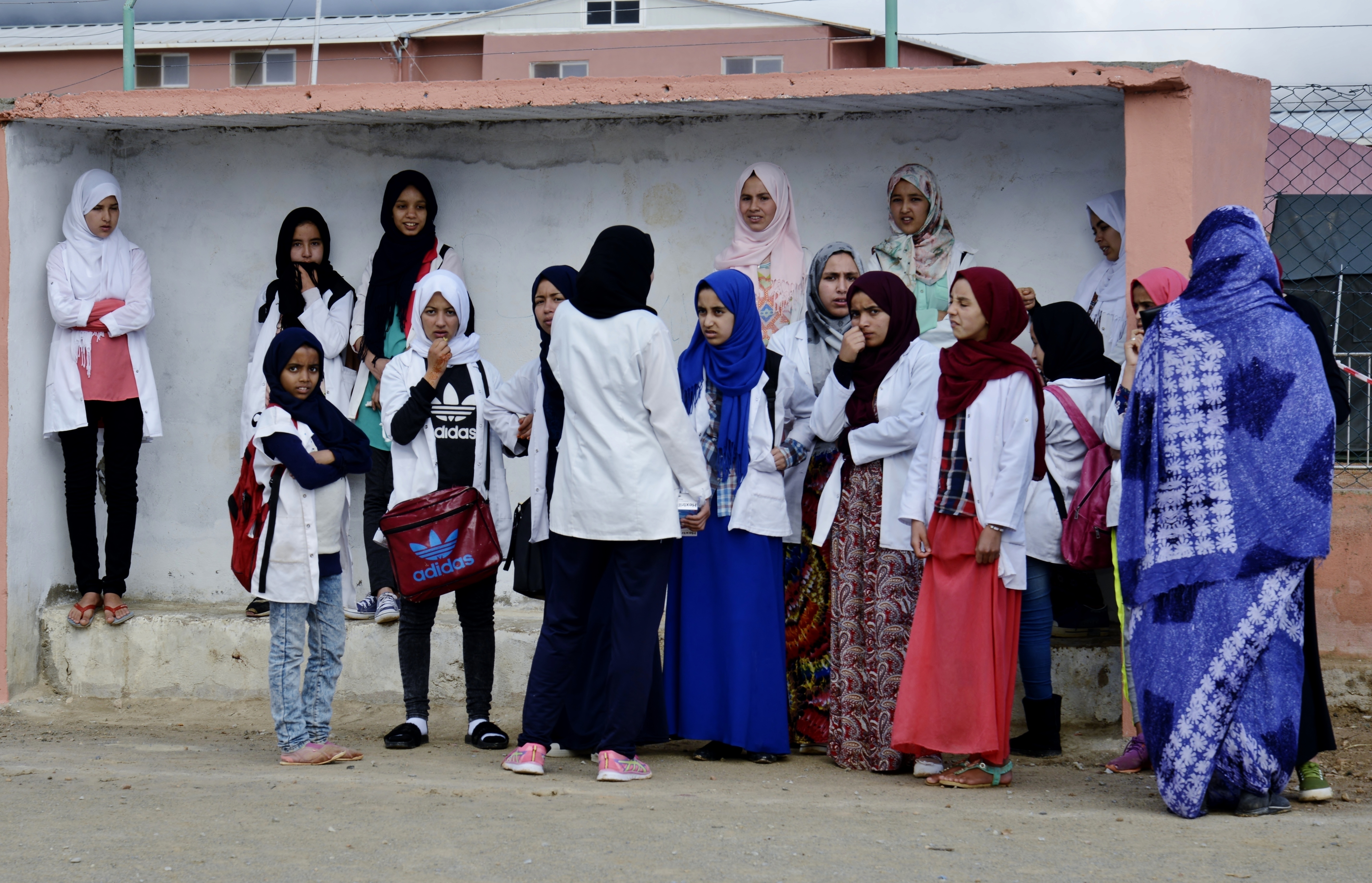 Moroccan women and young girls wait in the shade for dental services during the Humanitarian Civic Assistance component of Exercise African Lion 2018 in Bounaamane, Morocco, April 24, 2018. Exercise African Lion 2018 is a Chairman of the Joint Chiefs of Staff-sponsored, U.S. African Command-scheduled, U.S. Marine Corps Forces Europe and Africa-led, joint and combined exercise conducted in the Kingdom of Morocco. African Lion offers an opportunity to improve interoperability and cooperation while demonstrating the strong military bond that exists between the participating nations. (U.S. Army National Guard photo by Maj. Samantha Madsen)