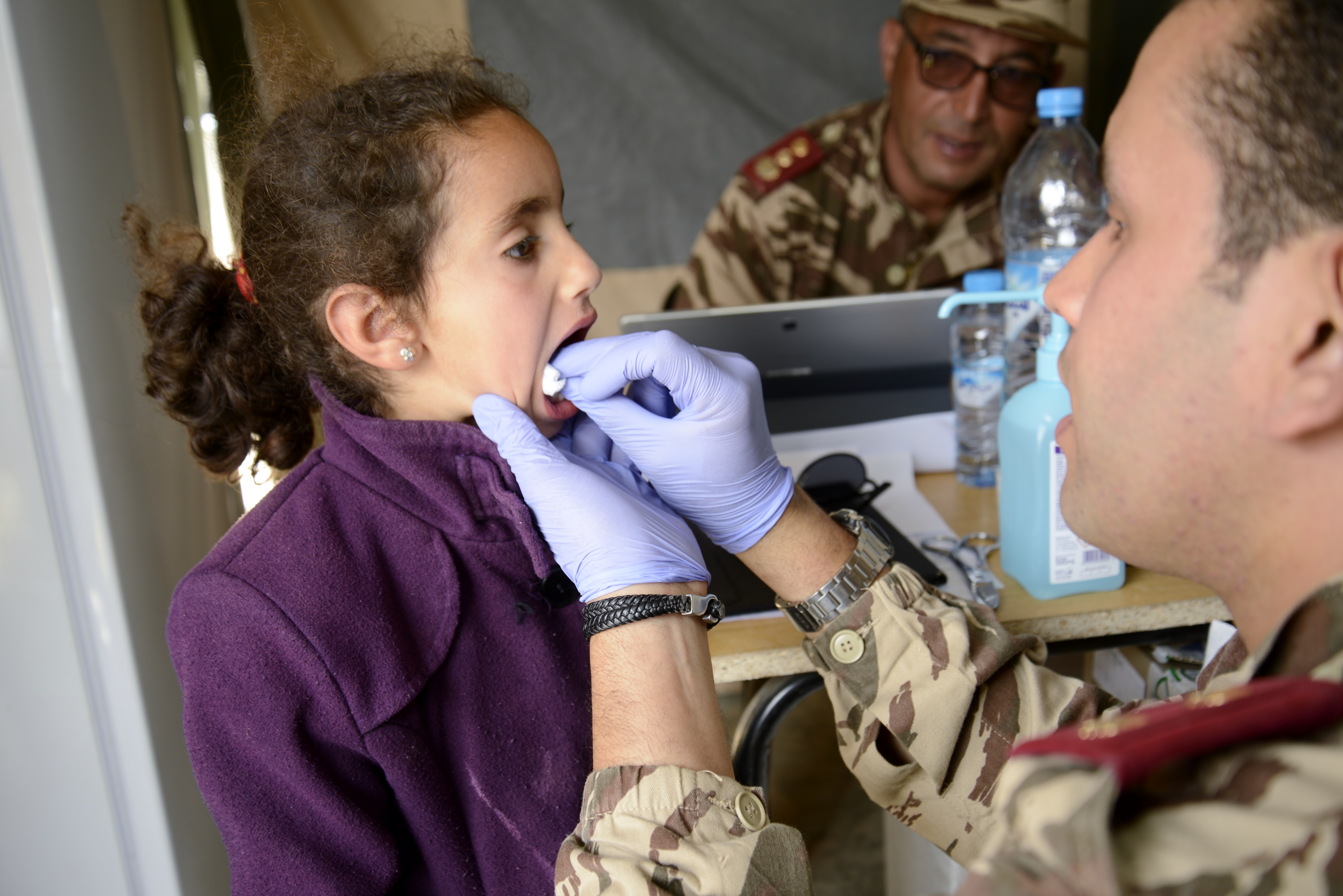 Moroccan 1stLt. Hamza Layat, a pharmacist and member of the Moroccan Royal Armed Forces, provides aid to a girl after a having a dental procedure during the Humanitarian Civic Assistance component of Exercise African Lion 2018 in Bounaamane, Morocco, April 25, 2018. Exercise African Lion 2018 is a Chairman of the Joint Chiefs of Staff-sponsored, U.S. African Command-scheduled, U.S. Marine Corps Forces Europe and Africa-led, joint and combined exercise conducted in the Kingdom of Morocco. African Lion offers an opportunity to improve interoperability and cooperation while demonstrating the strong military bond that exists between the participating nations. (U.S. Army National Guard photo by Maj. Samantha Madsen)